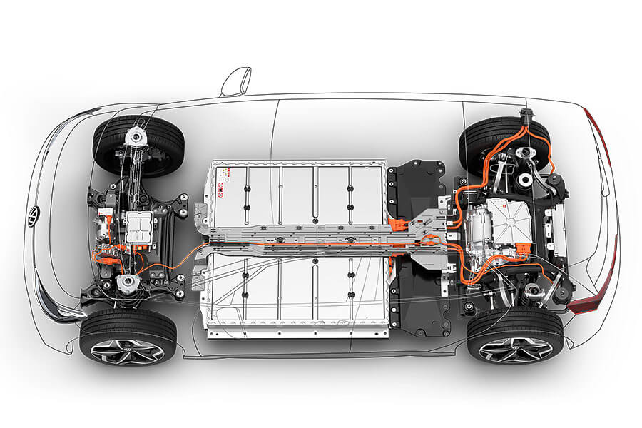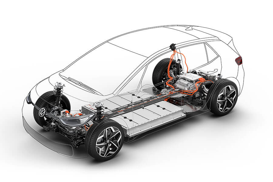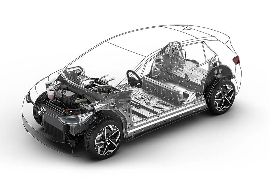 雖然少了燃油引擎,但如何安置同樣佔空間的鋰電池組也是電動車在設計上的一大難題。好在ID. 3車身下有MEB底盤解決這項困擾,並將電池平整地收在乘客腳下。受惠於MEB底盤加長的軸距與輪距,車內包括前、後排與行李廂空間皆比Golf更為寬敞,為這類緊湊型車款帶來新的標準。