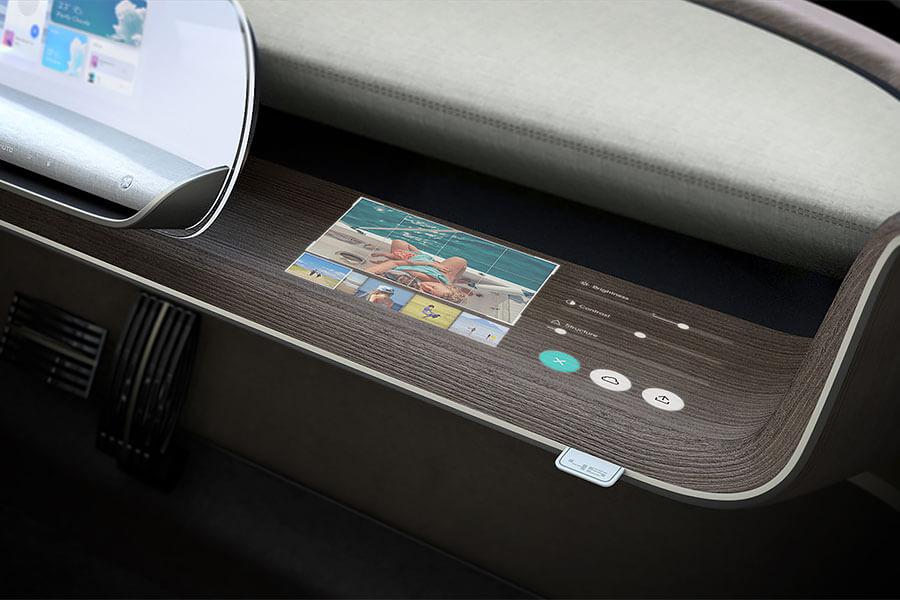 木紋飾板、皮質方向盤與布質座椅,45 EV Concept的車室空間以一種溫暖舒適的方式鋪陳,就像許多人家裡的客廳與起居空間一樣。不過再仔細看那幾張精緻的座椅,尤其是可以選轉朝向後方的前座,若要把整個座艙稱作貴賓室相信也不會有人反對。木質儀表板上,從左側A柱延伸至中央的超寬觸控螢幕,上方整合有儀錶組、導航系統、多媒體娛樂與空調系統。副駕駛座前方,另能將多媒體娛樂系統投影置木質儀表板上,就算距離中控螢幕較遠也能輕鬆進行操作。
