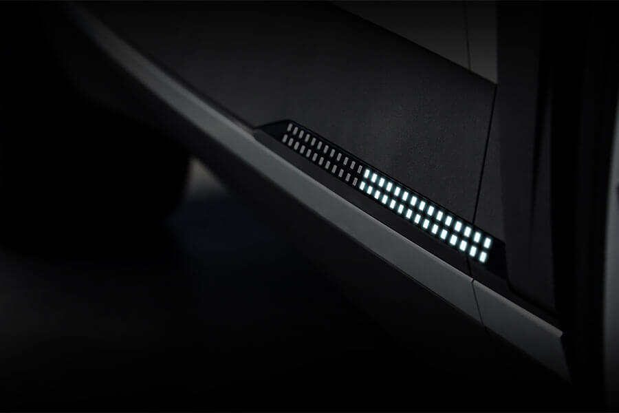 確實,光看車頭上的線條組合、LED頭燈與前保桿LED顯示均表現出了這個時代的特色。車身側面Z字型腰線,鋒利得像支蓄勢待發的飛箭,無邊框車窗與黑色車頂則使整體車格更加年輕。前門底部,LED顯示面板可提醒車輛所剩餘的電量,或許也能讓其他用路人了解為何這部車開得如此緩慢。對了,現時許多自駕概念車都擁有的數位後視鏡,45 EV Concept同樣也有,它就隱藏在車側腰線的最尖端。尾燈同車頭採用帶狀式LED設計,並以左右4個U字型呈現。後擋風玻璃底部,主動式尾翼則會在行進間自動升起。
