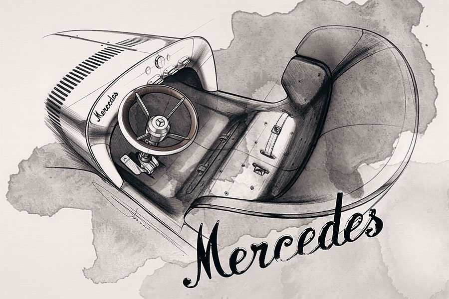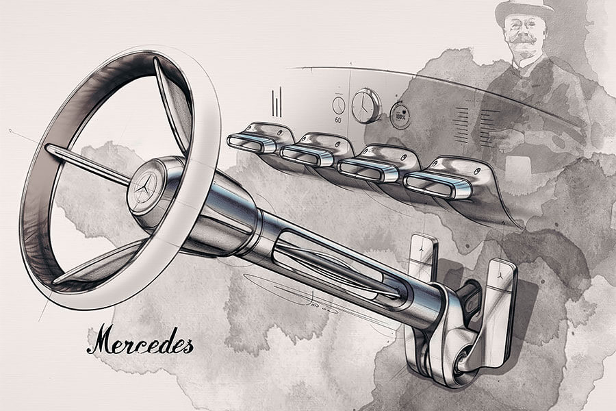 將時光倒轉回上世紀初的1901年,當時戴姆勒引擎公司(Dainler-Motoren-Gesellschaft)在Emil Jellinek的建議之下打造了一輛高性能車款。隨後化名「賓士先生」(Monsieur Mercedes)參賽的Jellinek,更以女兒Mercédès Jellinek名字將這輛車命名為Mercedes 35 hp,並且親自駕著它主宰了尼斯地區的Race Week賽車比賽。這也就是為何現在賓士的品牌名稱裡面會有個Mercedes的原因。