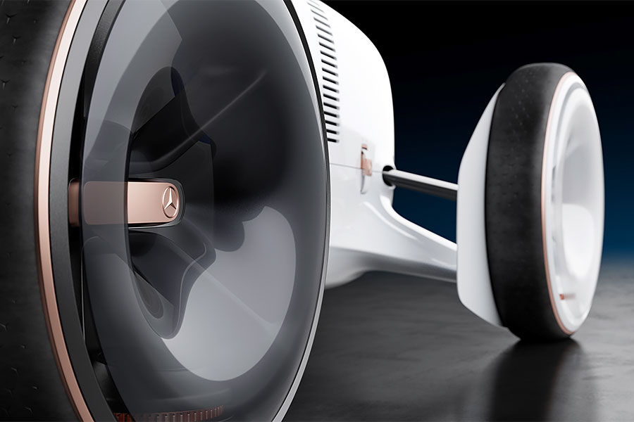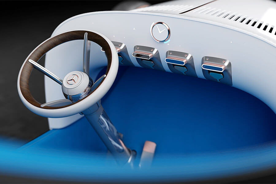 儘管Vision Mercedes Simplex明顯是以替代能源(電力)進行驅動,但其外型完美地以充滿未來感的手法重新詮釋了將近120年前的經典樣貌。雙座、獨立車輪、玫瑰金水箱罩鑲邊飾條,無一不讓人回憶起那輛以小女孩之名創下佳績的賽車。不過兩者不同的是,過往Mercedes 35 hp車頭上的水箱罩現在則改由黑色透明3D顯示面板取代,以符合這個世代的方式呈現。省略現行賓士概念或量產車款常見的Widescreen數位儀錶組,車頭從前擾流至儀表板採取一種連續性的設計,沒有任何一絲多餘的折線。
