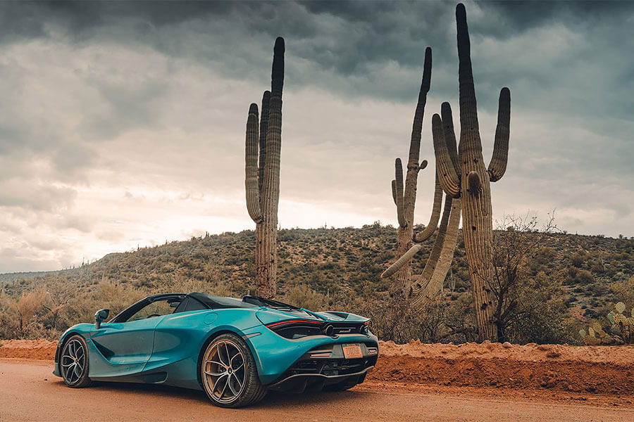 這股情緒實在太強烈,追究起來我會把責任歸咎於那些未有徹底燃燒的碳氫化合物。尾隨麥拉倫而行,你只會聞到一陣香梘般的化學品淡香。可是當我把鼻子伸到Cobra窗緣外一嗅,雙眼便馬上淚如泉湧。Tortilla Flat後面的一段公路開始越走越高,正好與四周風景相得益彰。我們兩天之前曾經偵察這一帶的情況,那時場地還十分乾爽,大地一片橙色。如今雨水卻換掉了整個調色板,既見地衣遍地開花,又見岩石表面綠斑斑,吸滿水的仙人掌顯得格外肥大,簡直生機處處。就一個享受視、聽、嗅覺之娛的平台而言,720S十分得體。深邃擋風玻璃意味著路面恍如貼著你腳底掠過,駕駛艙內雖有輕風吹拂,卻又相當密閉,因為低矮坐姿令人覺得被相對高聳的車門、擋風玻璃和迴風機置四面包圍,換句說就是安全感。在其中一邊經常有落石,另一邊是千丈懸崖的路上開車,這份安心感覺無疑大有好處。