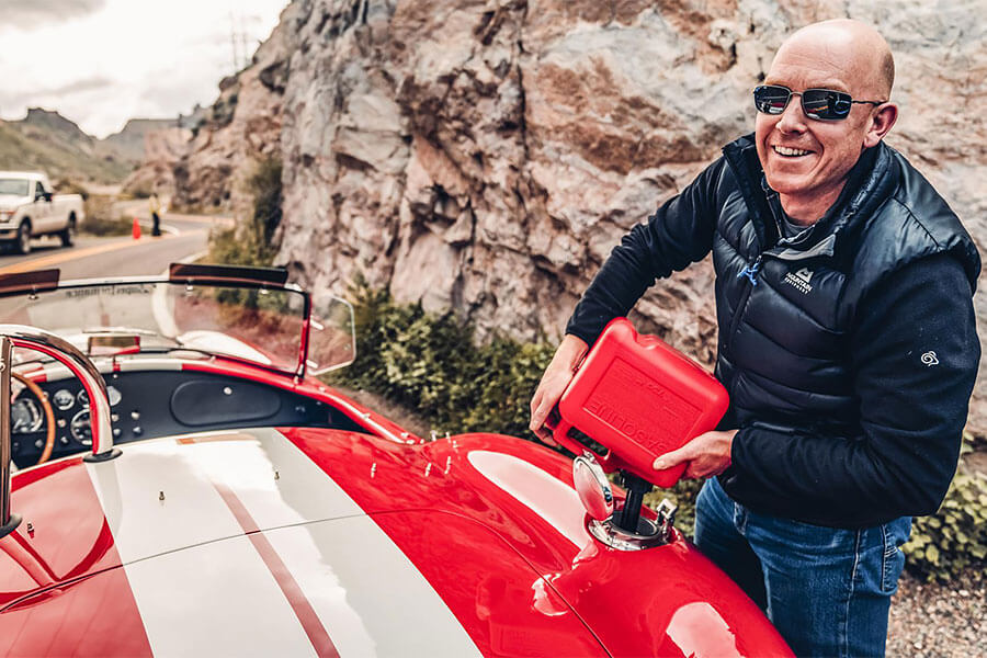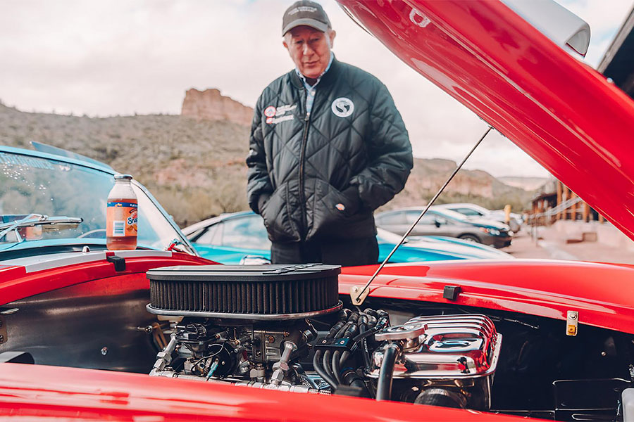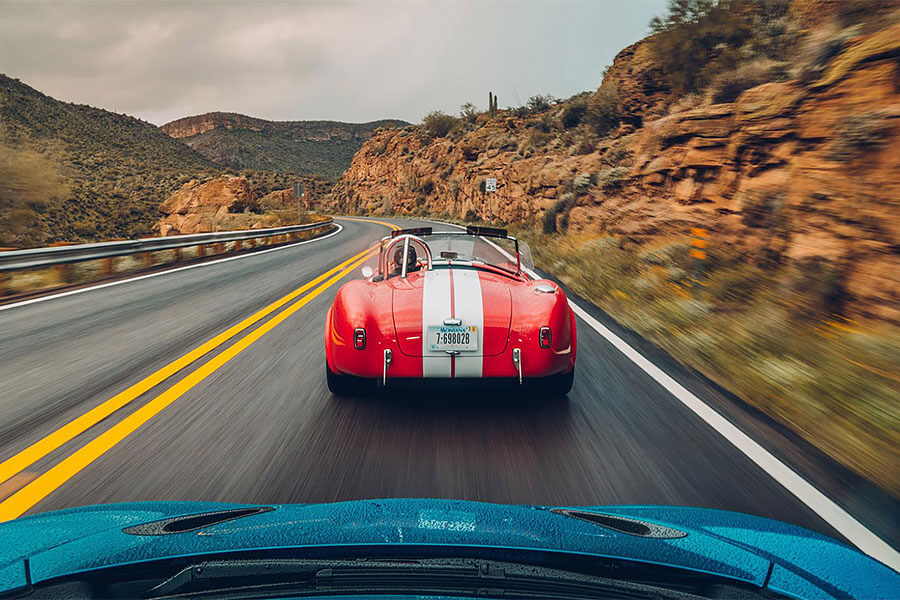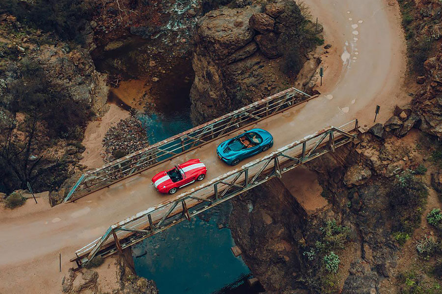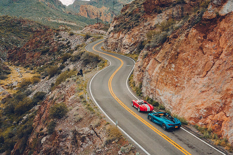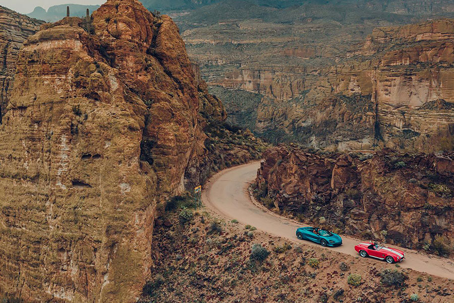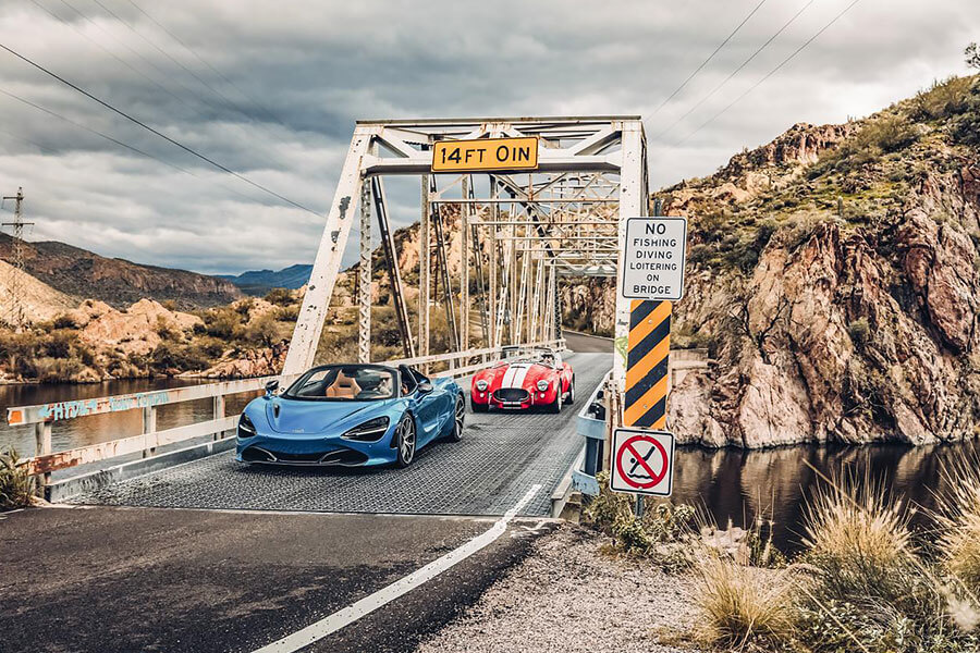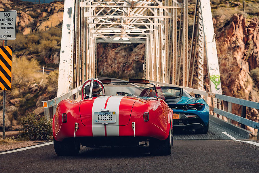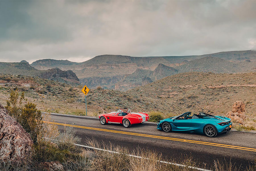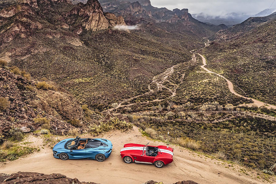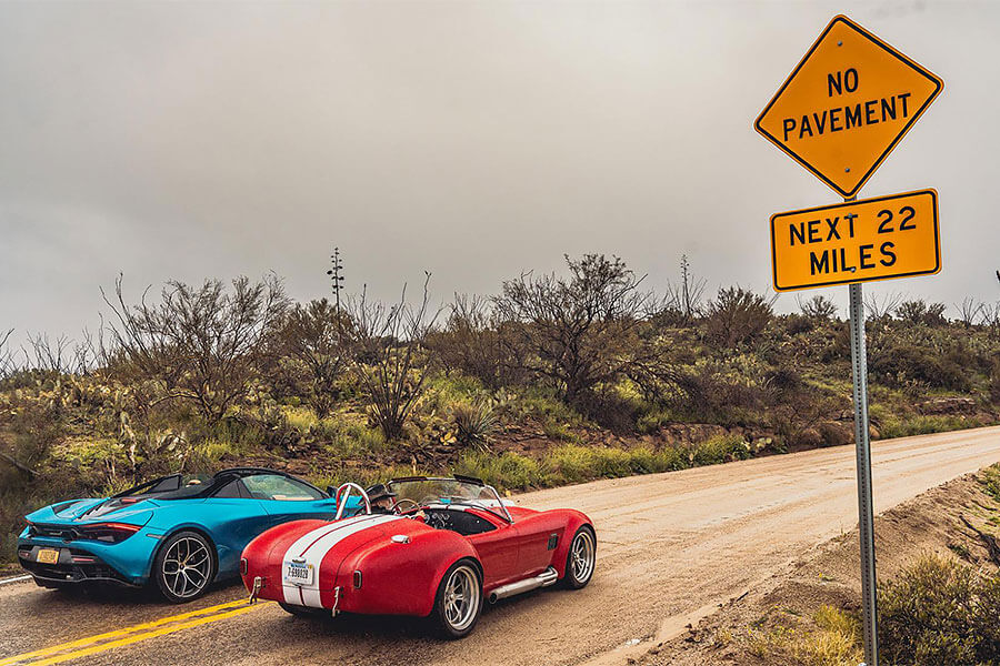 走到這裏已經夠遠了。於是我們折返原路爬出峽谷,兩部車越往上攀,信心也顯得越來越壯。事實證明我們原來走了好幾里越野路,只因為亞利桑那的風景實在太迷人,誘使我們忘乎所以地繼續前行,繼而因為這兩部車和壯觀背景交織而成的磅礴氣勢而樂極忘形,事後才驚覺無論手握瘦削的木製方向盤,抑或升起250,000鎊340km/h飛毛腿的活動式儀表探索這片秘境,都是極其瘋狂的行徑。所以重回柏油路時,對我們來說可謂一大解脫。抖擻精神重新連接飽受磨損的神經後,一行人便浩浩蕩蕩朝著Tortilla Flat踏上歸途,繼而發生Cobra打嗝拋錨的插曲。