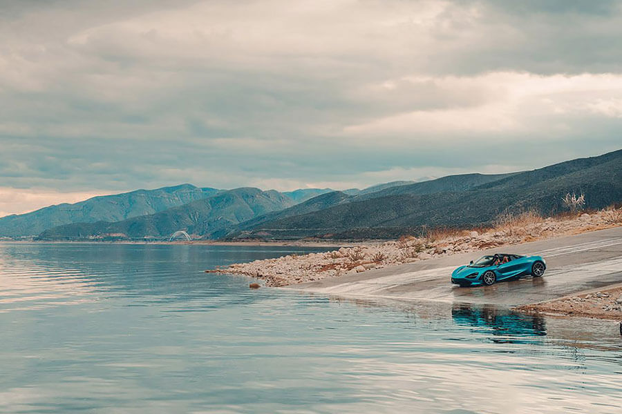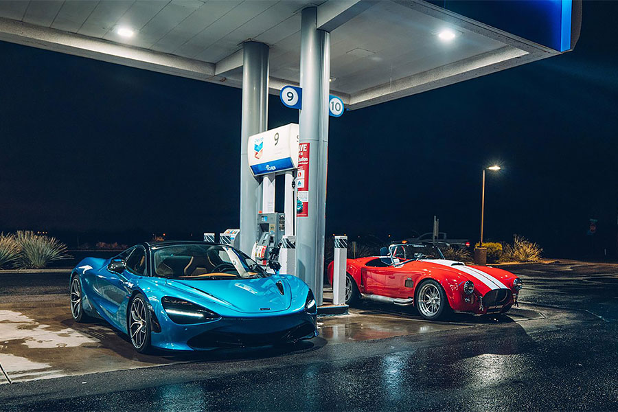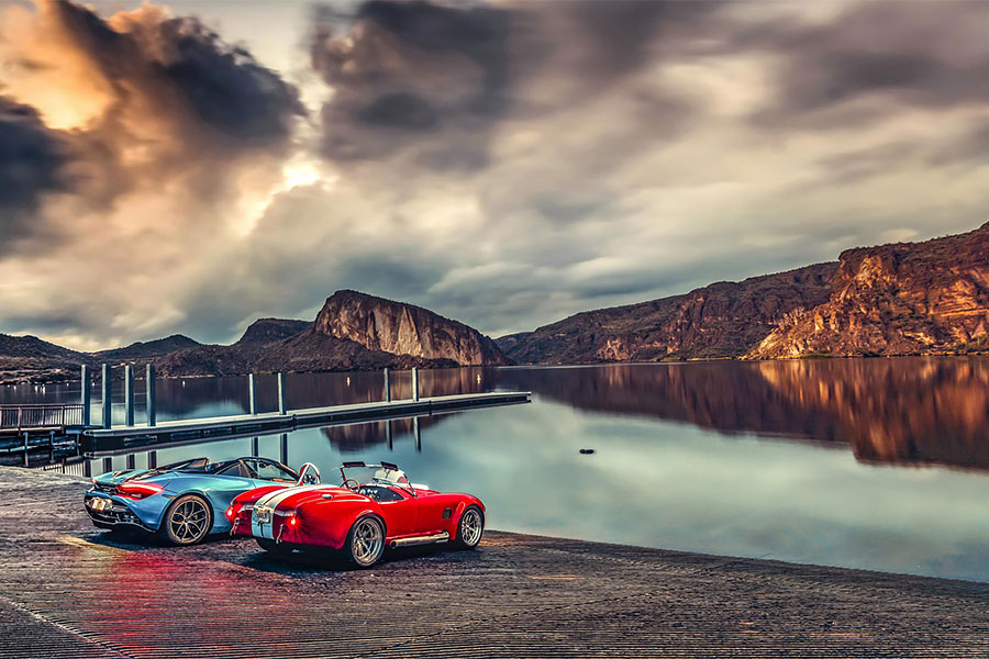 原來是燃料用罄。理所當然嘛,Shelby Cobra的前身本來就是風華絕代卻又生性乖僻的六零年代英國跑車AC Ace,所以我輩應該料到那個「還有四分一桶油料」的油量計絕不可信。但事已至此,在下唯有匆匆趕上買一罐汽油。無奈這時正值遊客下午出沒的高峰期,阿帕契驛道上的車龍只能用35km/h左右的速度慢慢下山。這班懶鬼啊!開車開得這麼慢,簡直豈有此理。喔,是呢是呢,落在車龍後面幾哩外的那個人就是我,不過這樣反而正合我意。所以我打開了麥拉倫的車頂懶洋洋離遠跟著前方車群,給自己多一點空間免得盯著本田CR-V的車尾門把加重精神壓力。這時開Cobra應該會比較容易打發時間,雖然操縱上要較為專注,但這種程度我受得了。如是者過了好一段時間,我們決定在Canyon Lake湖畔的下水滑道旁停下來靜靜等待,等待最美好的一刻,等待車流消失但尚有足夠餘光讓我們享受阿帕契驛道回程的美好一刻。日落?無緣欣賞日落吶,但我們手上有一條精彩道路和兩部好車。我可以告訴你,這些可是得天獨厚的條件。這兩個怪傑雖然相隔了半個世紀,本質上卻如出一轍,兩家都是享受歡樂時光的跑車,逍遙萬里的好伴侶,同樣值得在下脫帽致敬。