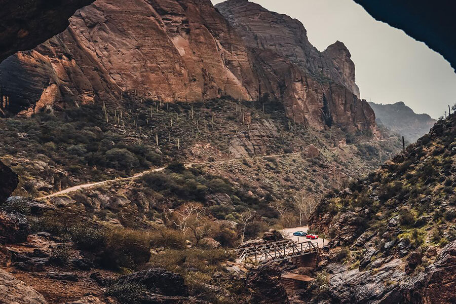 抵達阿帕契驛道(Apache Trail)時,天尚未明。這條公路原本是阿帕奇族翻越這片山區所用的古道。事緣十九、二十世紀之交,鳯凰城需要確保水源,Superstition Mountains深處的Salt River因此成為霸佔得好……喔,對不起,應該是壩建得好的地點,於是乎便需要開闢道路通往該區。於是當局動用了超過半百萬美元,將阿帕奇族的古道變成平坦大道。時任美國總統的羅斯福更親臨此地留下這番評語:「阿帕契驛道結合了阿爾卑斯山脈的雄奇,洛磯山脈的壯闊,大峽谷的瑰麗,此外還有一股無以名狀與眾不同的氣質。對我來說,這是大自然自古以來最凜然壯麗的景致。」這番話固然是總統先生在公路啟用當天的致辭內容,但阿帕奇驛道就是這麼奇妙,你在這裏真的可以找到阿爾卑斯的所有特色。