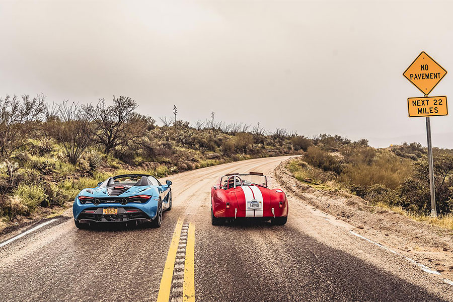 雨水啊雨水,當地五年來最多的雨水。不過對720S Spider並未有構成甚麼問題,縱使走在表面好像洗衣板的顛簸泥路上,滑動式玻璃車頂猶能在11秒之內悄然關上。Cobra又如何?這部跑車壓根兒就不喜歡洗衣板,因為密麻麻的路面坑洞會害得整個車架像果凍般晃來晃去,未免有失體統。Cobra畢竟是超級Roadster的開山祖師,堪稱Route 66迄今江湖地位最崇高的肌肉車,世上再沒有其他汽車比停放在巨型仙人掌旁邊的它更加相得益彰,絕對沒有。