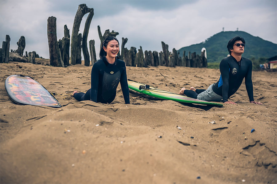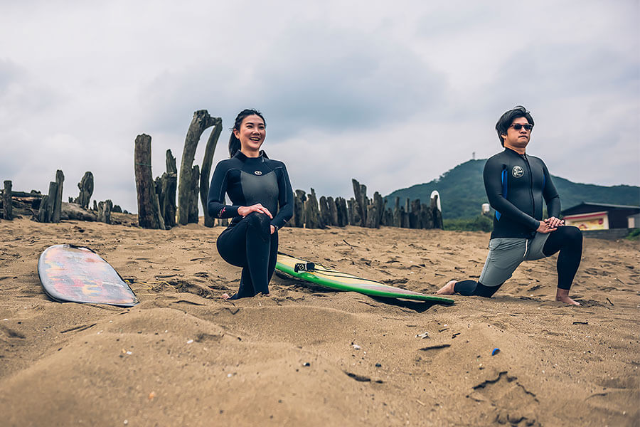 雖然有著游泳校隊跟一點海泳的經驗,但衝浪一直是個有緣無份的活動,這不知道跟我不愛戴隱形眼鏡,拿掉眼鏡又視線不清有沒有甚麼關係。總之第一次下場試招,基本動作就得先打好根基,不囉嗦,先跟著麵包老師的瑜珈熱身動ㄘ動,下水最怕抽筋,你知道的。