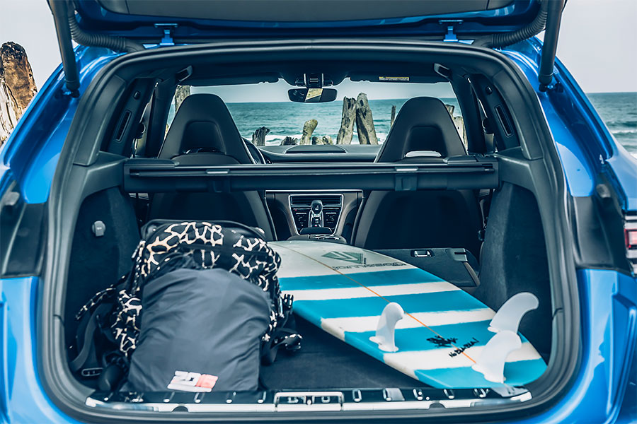 既然投身旅行車行列,那麼在空間利用上就會是大家更關注的焦點,不過我相信這級距的買家可能不會這麼在意這件事。但的確在Panamera Sport Turismo的車上看到第一次運用的一體式後座椅,而非堅持四門車型的獨立四座設計,或許這就是一種配合產品需求所作出的調整,不論閣下要用妥協還是變通那個方向來解讀,的確它現在可以入座五人,但中央隆起的高度並不是太好坐。除此之外,520公升的基本容量比四門版多一些,但後座椅背可向前打平,日常運用起來會方便不少,例如我可以輕鬆放進這趟試車行最重要的一項工具-衝浪板。