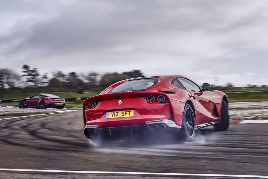 擂台紅色一方的法拉利812 Superfast也是發展自既有車型,性質相當於F12精煉版,身上設有新型進排氣槽,自然進氣V12能夠在8,500rpm吐出789hp,最高轉速達到8,900rpm。換言之Aston用渦輪增壓器完成催動扭力的工作略為回氣準備下一輪升檔時,法拉利只不過剛剛開始發揮其凌厲轉速。它還有一台快似鞭抽的七前速F1雙離合自手排變速箱,最大扭力雖然小於Aston(73.2kgm),卻有大量電子輔助系統幫你妥善管理強大火力,輕快俐落的感覺勝似限量生產的F12tdf。懾人魅力亦不讓Aston專美,看見它的人似乎莫不喜出望外,儘管有些人一聽它的身價或許會當場噴出來——跟圖中所見規格一樣的812 Superfast,索價可是超過35萬鎊,比同場較量的Diavolo Red紅色Aston貴了幾乎8萬鎊。