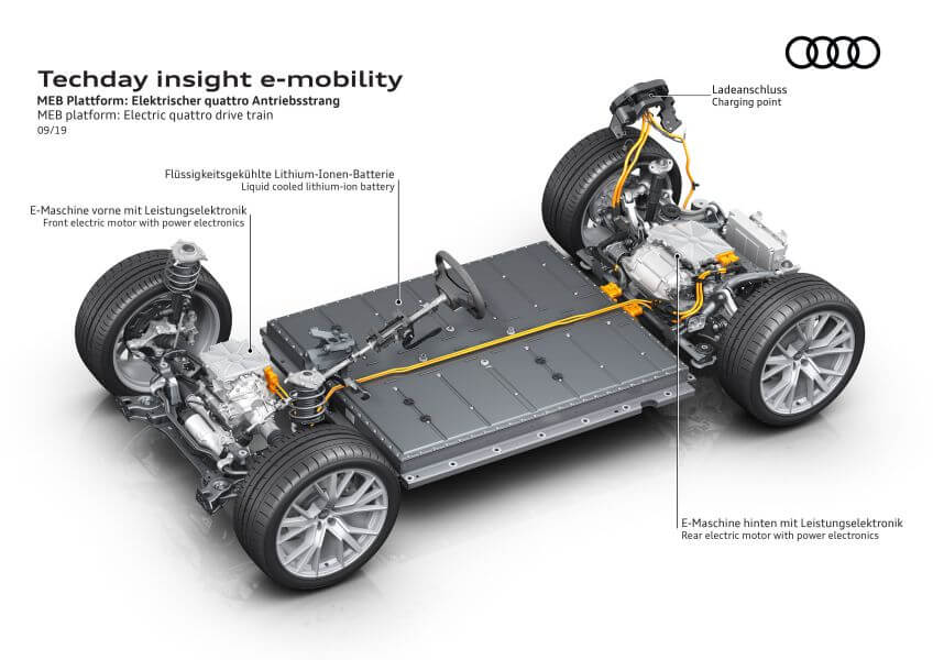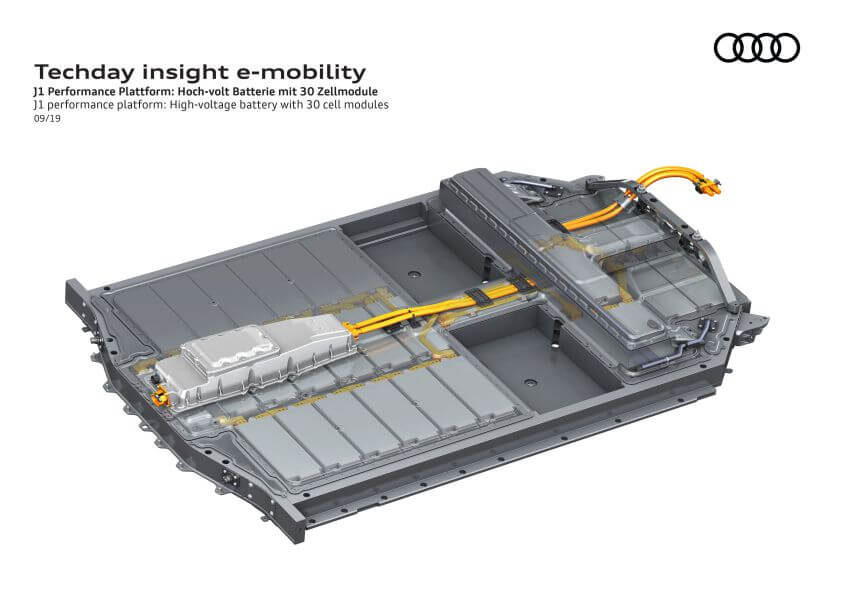 1.e-tron:基於原有在A4、A6等車使用的MLB EVO模組化平台進行改造而來,最高充電量為150kWh,30分鐘完成充電。