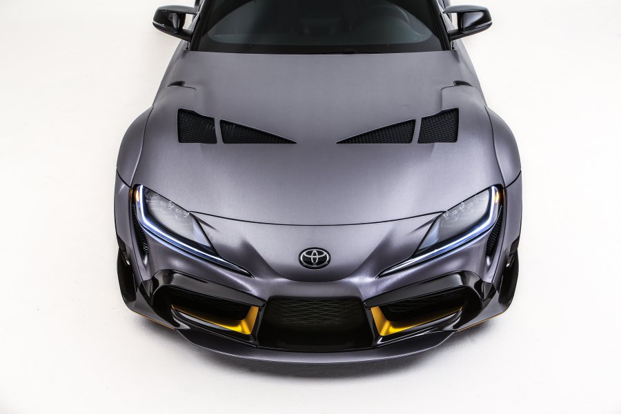 全新的空力套件設計大量糅進了TRD3000GT的經典元素之外,TCD部門更將TRD3000GT上的通風引擎蓋及大型尾翼直接移植套用,更自豪宣示能為GR Supra提供了更佳的空氣動力學,並將牛魔王應有線條表現的一覽無遺,後方採用HKS打造的排氣系統,塗裝則用上拉絲銀及金漆包覆,大膽展現出GR Supra的激進線條。