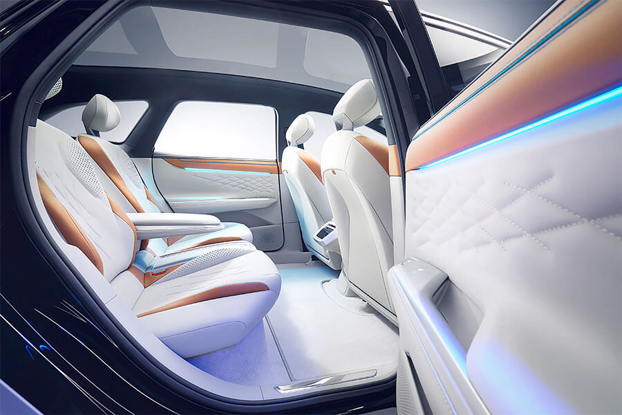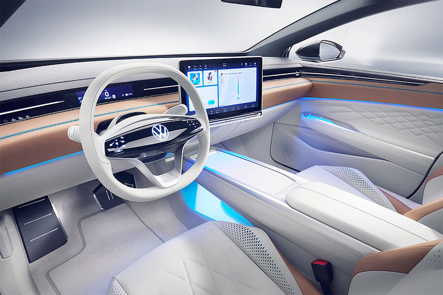 ID. Space Vizzion車內主打和SUV一樣的寬敞空間,以及由大面積全景玻璃天窗所創造的空間開闊感和充足的採光。數位化駕駛艙中控檯配有一面15.6吋觸控螢幕,包括空調和多媒體娛樂系統皆整合在內。駕駛座前方現在只剩下一個小型螢幕,其他重要的資訊則會呈現在AR抬頭顯示器上方。另外,在這款概念車上福斯也首度嘗試使用了以回收蘋果皮混合20%聚氨酯製成的AppleSkin材質,並藉此設計出優雅、簡約和質感兼具的內裝風格。