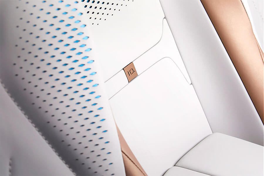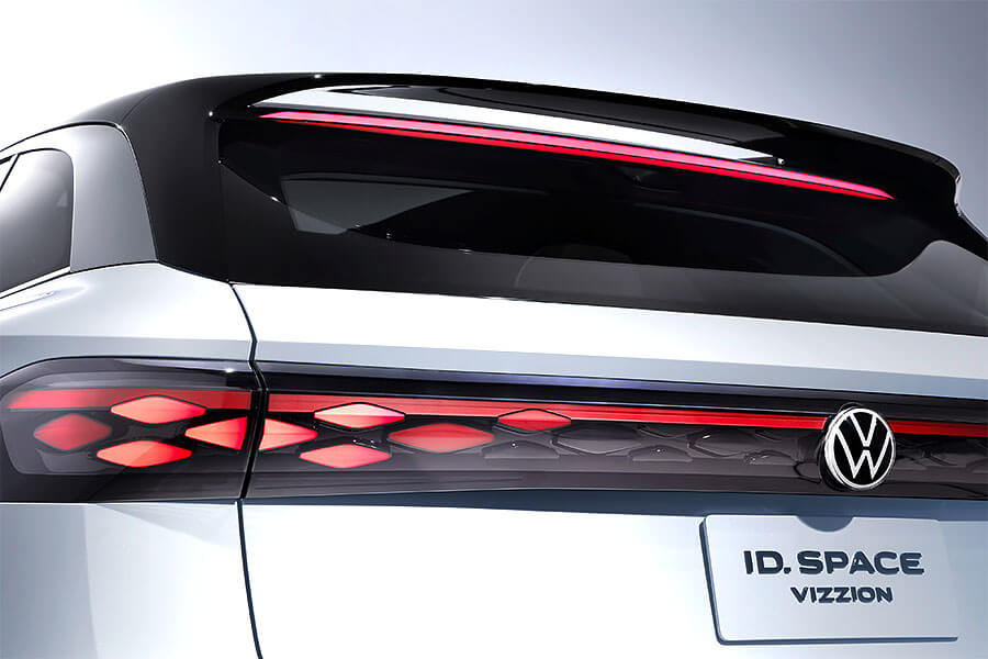 車身既平整又光滑柔順的ID. Space Vizzion,因電動車不再需要傳統水廂,因此在車頭不必再顧及水箱罩這項設計元素,所以這下子創意多了更多發揮空間。於是福斯設計團隊就在前保桿上規劃了一些孔洞,同時在兩道Matrix-LED頭燈組之間也採取了鏤空設計,讓氣流能從中通過並引至前擋玻璃和兩側,接著再進而導向車尾,創造出有如GT跑車般的0.24cd低風阻係數。此外車頭發光廠徽也和ID. 3相同,同時還有一條細長LED光條從兩側延伸至葉子板前方。如同當代許多車款那般,在ID. Space Vizzion車門上也找不到任何門把設計,取而代之的則是四個發光虛擬門把,只須從車外觸碰光源即可將車門開啟。類似的設計在電動啟閉尾門上同樣可見。