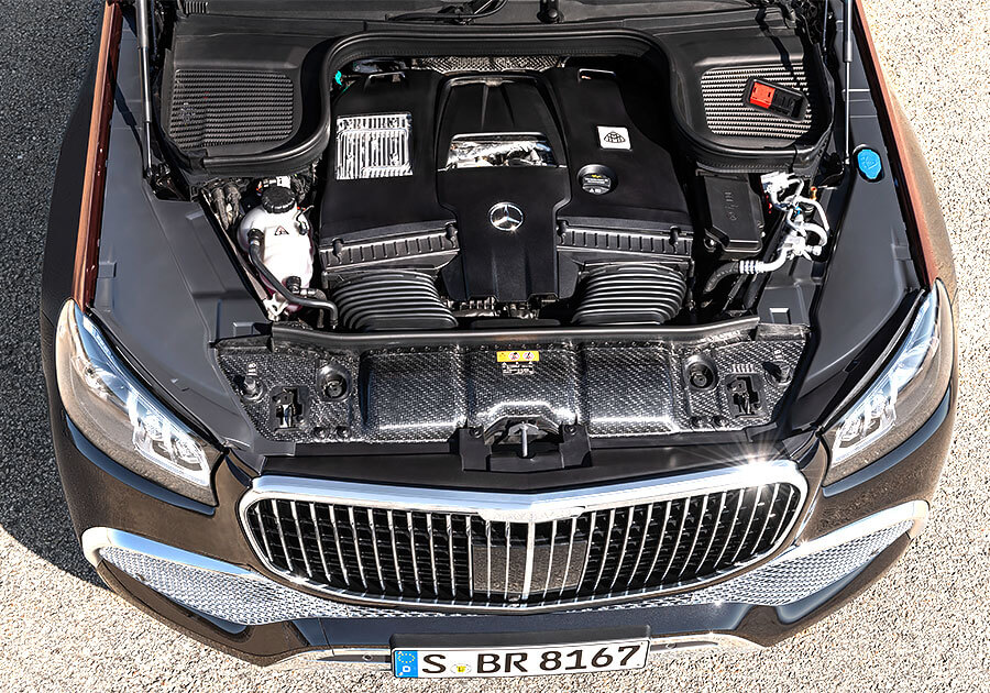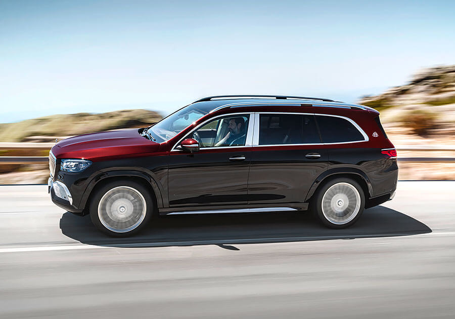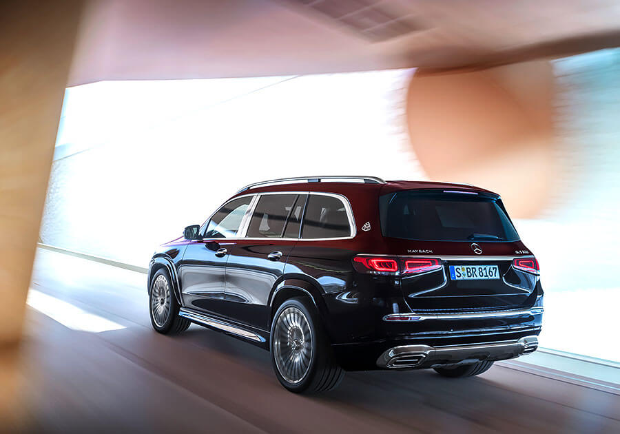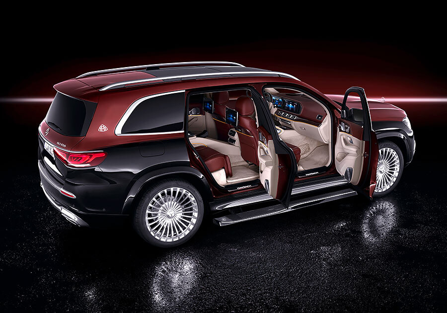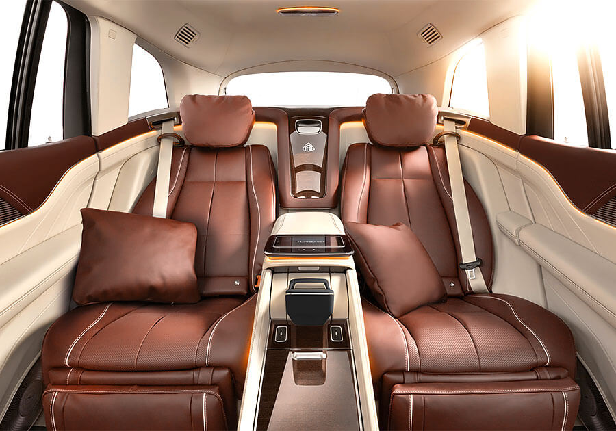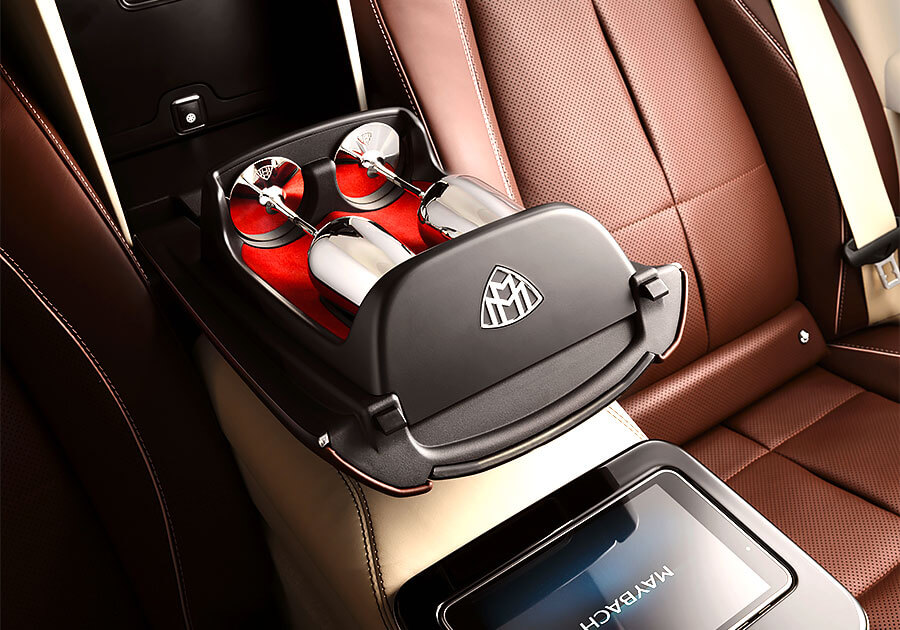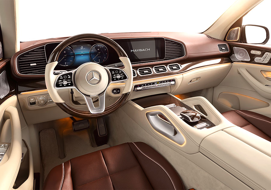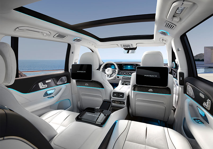 和標準三排七人座的Mercedes-Benz GLS不同,Maybcah GLS車內採取標準兩排五人座配置,後座兩張獨立總裁座椅更標配有空調與按摩功能,同時也能選配額外由真皮包覆的抱枕提升乘坐舒適性。如果選擇四人座配置,另外還可以選配一個前後座相連,且配備恆溫杯架、加熱扶手、摺疊桌,以及一個可放進三瓶上等香檳冰箱的大型中控。除此之外,其他內裝配備還包括有電動窗簾、全景玻璃天窗、觸控面板、獨立空調、後座多媒體螢幕(MBUX)、Burmester環繞音響,以及能發出白色桂花香味的Air-Balance Package套件。而座艙和行李廂之間的隔板不僅有助於保障車內隔音品質,同時也能帶來更好的視聽效果。