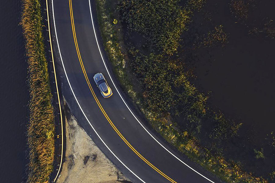 我們必須指出「在夕陽下風光如畫的沼澤中取景拍攝」其實比乍聽之下更為滑稽可笑,可是Bombay Hook自然保護區一帶的氣氛實在太美妙,受盡風吹的傴僂樹木與池水彷彿在有幾分像核爆的斜陽中一唱一和,簡直詩情畫意。夕照則好像1980年代某些汽車廣告中所見,在樹影和水波之間喜跳躍舞動,置身其中的GT-R50簡直光輝耀目。這裏有鄉間道路,有彎路讓我們玩個痛快,拍攝地點上面的避車處更停泊著一部狀似破破爛爛的雙廂皮卡。當我駛近它停在一旁時,一個體型壯似熊人身穿類似橙色囚犯衣的男子心平氣和從pickup走下來,然後伸手從床下抽出一把碩大無朋的複合弓,以及一枝白・色・箭。