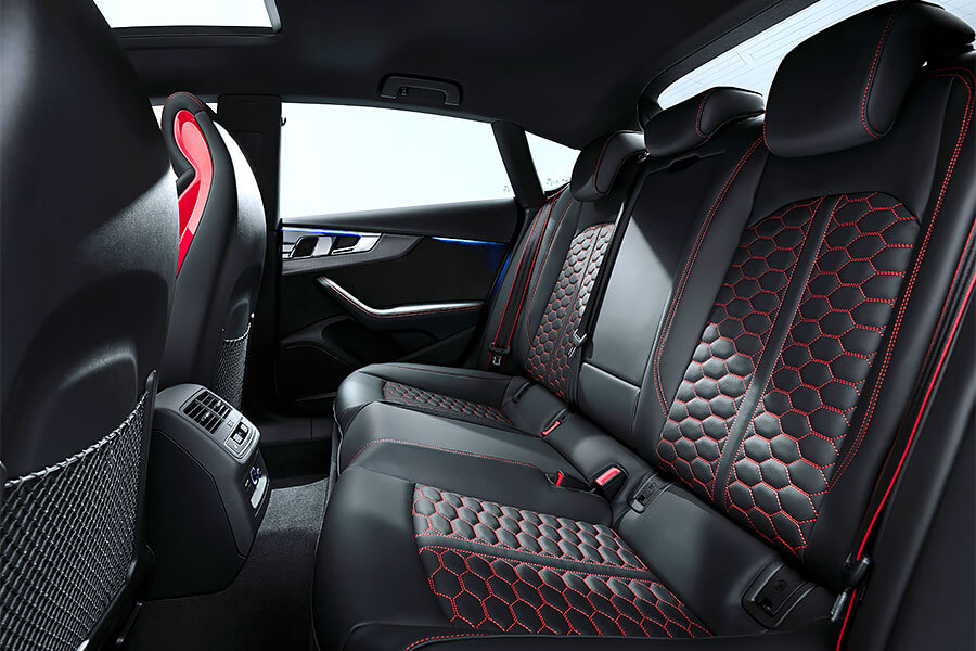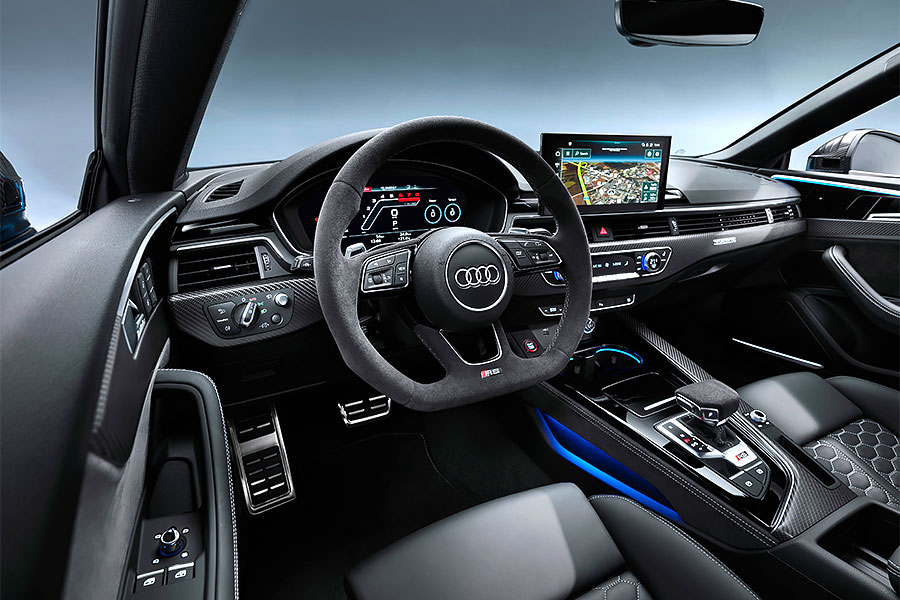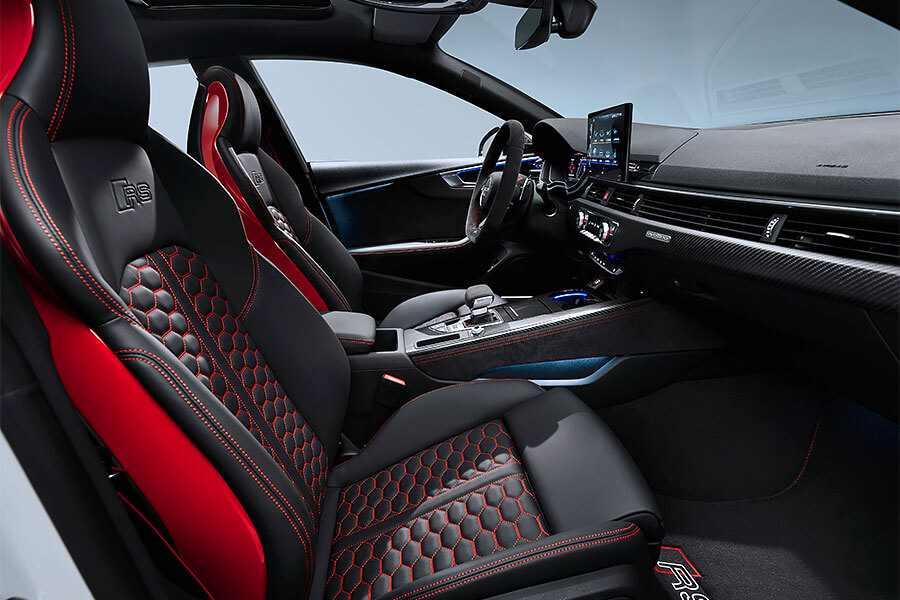 車內和小改款前最大不同為10.1吋的數微儀錶組,所選配頂級MMI Navigation plus多媒體系統(第三代MIB系統)和12.3吋的Audi virtual cockpit plus全數位虛擬座艙,儀錶組上即可顯示RS車款特有的相關性能數據,以及更多不同的畫面風格。和近期所發表的RS車款相同,RS 5 Coupe和RS 5 Sportback的Audi select drive可程式車身動態系統也新增有RS Mode,車主能將偏好的引擎、變速箱、轉向、底盤懸吊等參數進行個人化設定,儲存在RS1和RS2兩個模式中,並透過按下方向盤面的快捷鍵進行模式切換。而原本已經運動感十足的駕艙,另可額外選配RS設計套件,為方向盤換上Alcantara麂皮皮套,以及紅色或灰色對比縫線。此外,車上亦標配有30種以上主動與行車輔助系統,並可透過Audi connect擴增多種線上服務。