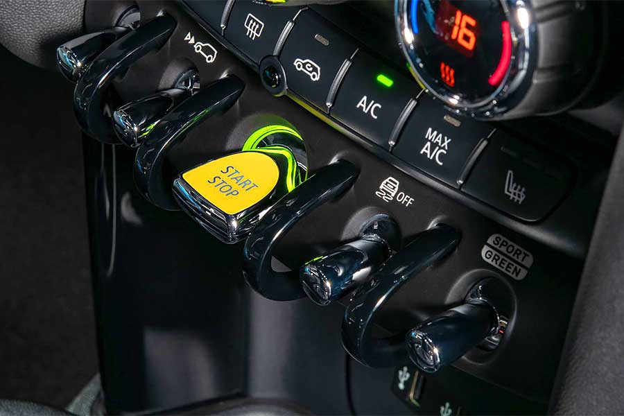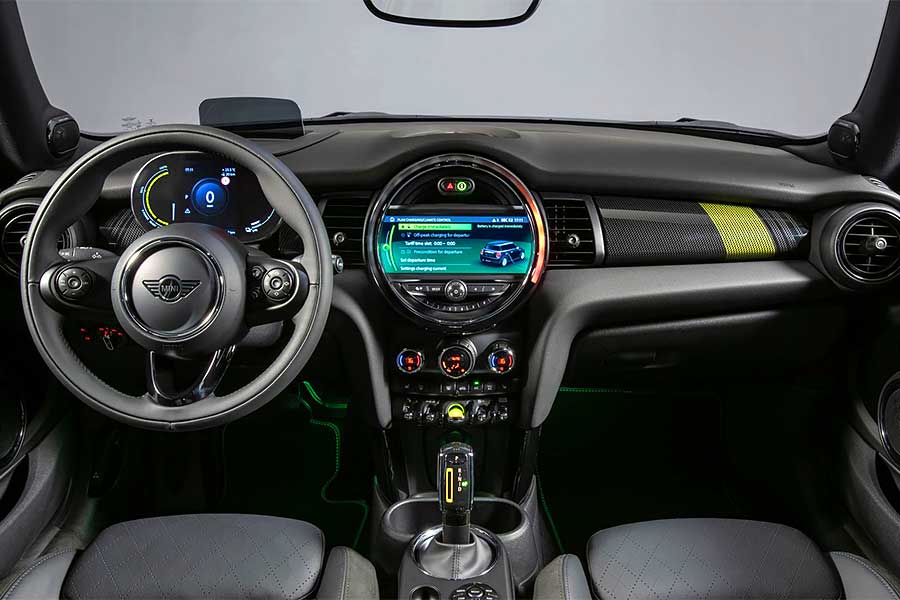 車廂方面,這是方向盤後面設有新型浮動式數位儀錶的第一款Mini,其他型號日後更新也會採用這種儀錶。儀表上有一個耗電量計,好讓你知道自己右腳有多沉重。坐左邊開車的話,充電要在車身右邊插線。廠方用一層防反光膜覆蓋整個車身,在陽光猛烈的日子確有此需要,可是從旁觀看會覺得有點像透過浴室磨砂窗隱約看見你的主要器官。中控台略有修改,上面設有三門Mini初次使用的電子手煞車(當場噓了一聲),儀錶板上可見一些用來調整煞車能量回收強度、變換Sport/ Mid/ Green駕駛模式和關閉牽引控制功能的撥桿。