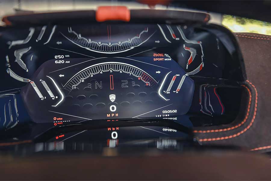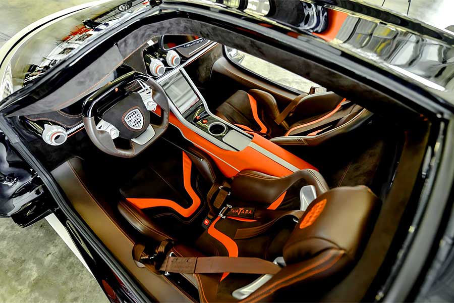 碳纖維車身加上量產型所用的特製碳纖維底盤,SSC的重量不外乎1,247kg,比Aventador輕了272kg。打開劇力萬鈞的天鵝展翅車門,一個高度特製的車廂馬上映入眼䈴。以HMI為例(Human Machine Interface,大部分限產車型最頭痛的課題,而且很容易暴露車廠用了哪一家OEM的電腦主機保你出入平安),SSC便聯同一支挪威隊伍開發了一套獨門系統,系統本身還可以跟手機上的特製軟體互動,以便閣下接通車上系統和更改諸般參數,範圍包括懸吊高度,遙控即可……