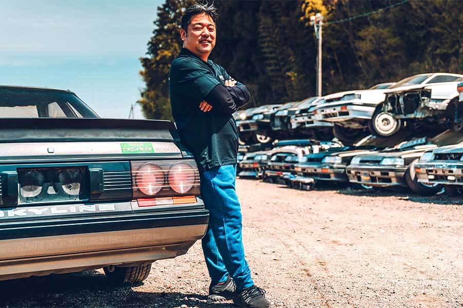 「目前我在日本有超過3,000名顧客。疊在最上邊的車用於剝皮,下邊的用來拆機件,單獨放置地上的那些屬於車身狀態良好,可以用我們自行製作的超過二千種組件徹底翻新。」