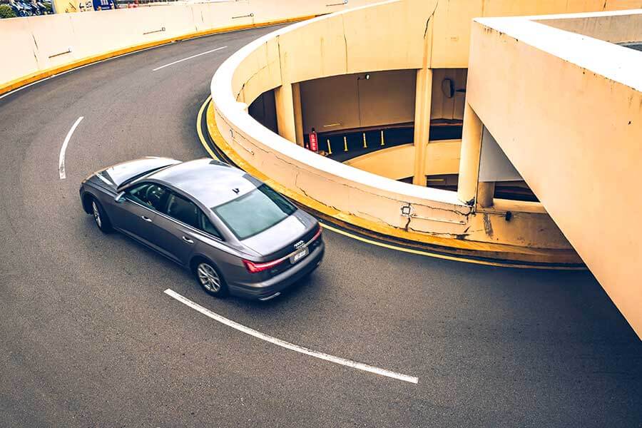 雖早有預期但依舊是令人失落的前輪驅動配置,但在底盤設定上可一點也不隨便,前後輪用上五連桿結構設定,除了底盤用上大量鋁合金零件外,就連其他細節也沒放過,例如:鋁合金車門、鋁合金煞車卡鉗及碳纖維加油口支臂,一切都為了提升動態反應的因應之道。A6這次也為了空氣力學肆意將底盤平整化,可提供更優異的風阻,甚至直接將跑車轉向系統列為標配,根據車手使用狀況能隨時調整轉向系統力道輔助;當然前方所列的一堆針對下盤而來的設計,並非為了要讓A6在路上囂張跋扈不可一世,主要還是為了貢上更舒適的行車品質,A6以一輛高級中大型房車自居更能揮灑自如,畢竟這層級的買家絕非血氣賁張的毛頭小子。車身剛性跟動態轉向絕對合乎該有的標準,收放自如的懸吊系統調教的恰如其分,近1.7噸的體態真的要耍起來倒也不隨便,入彎側傾角度稍大卻毫不軟腳,A6該給你的回饋一點也沒少,絕對有資格擔任一部帶著一家老小的高級房車。