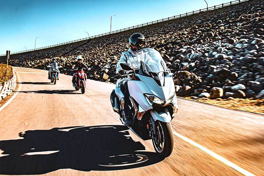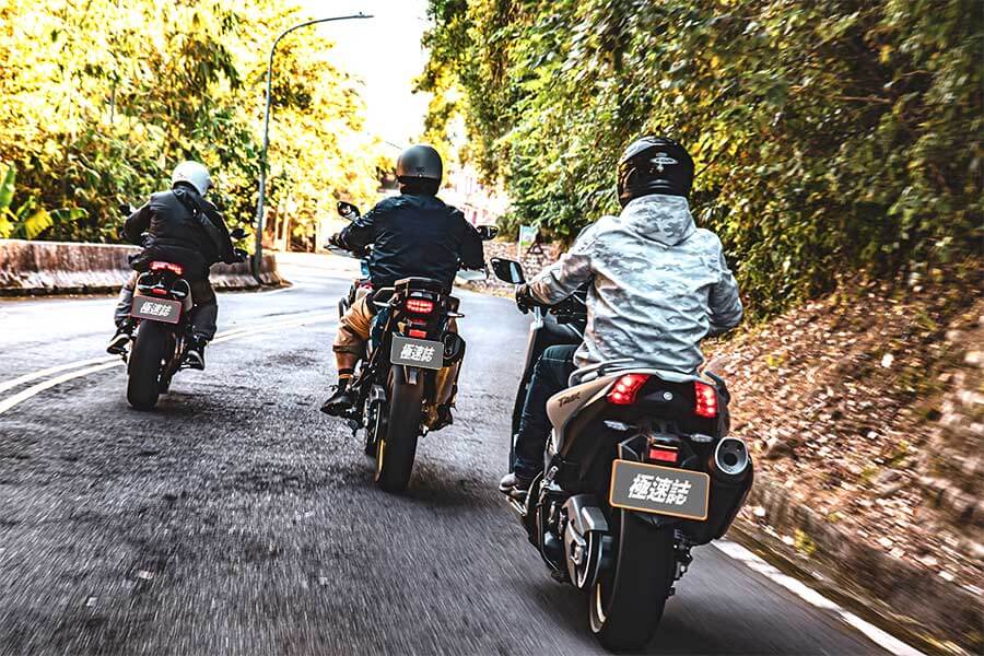 當然,畢竟這還是一輛200公斤多的車,不過我覺得他是重機界的洪金寶,一位靈活有餘的胖子。雖然說要跟上火力全開的Jason與Ducati是有點困難的事,但是以我平常其實騎重機趴趴走機會不多的狀況下,其實我注意到我的車速其實比腦海裡判斷要來得快不少,這除了了來自於大車體的穩定度之外,也的確展現了這部運動大羊的能耐,我所做的就是順著路面的曲線來遊走,也不需要刻意去做出太多引導車身的動作,它就可以輕鬆地維持在不慢的均速,我覺得新手或像我這類中等水準的騎士,T Max的確是不錯的練習基本功與建立騎車信心的好幫手,而且平常還可以騎著去買個早餐上個班,那天下班突然想要溜一趟北海岸還是環快,也不用特別跑回車庫換裝牽車,按兩個按鈕、油門一轉,心情就跟著開闊了。