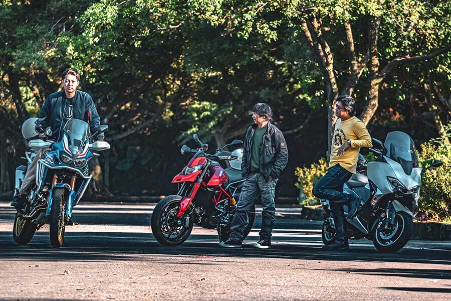 Jason選定的Ducati Hypermotard 950非常厲害,此毒物可說是萬萬沾不得,對於嘗過的朋友相信對它日以繼夜魂牽夢縈也只是合乎常理了,就我而言,Hypermotard 950的動態表現遠勝過舊款許多,靈巧的車身配上更易於上手的坐姿,硬朗底盤也比老傢伙突顯的多,身懷一具114匹馬力的L型雙缸絕對兇猛,卻不會覺得難以征服,無論對於檔車新手或是老鳥來說,絕是難得一見的奇才之一;老實說,球褲一向對大羊並無太多慾望,但Edward挑的T-Max確實是速克達中的熱門人選沒有之一,雖然上頭還是有排氣量更大的漢堡人及C650,但踢媽具備的操控及易於改裝特性,卻是其他大羊無法比擬的,雖說如此,腹內這具水冷並列雙缸運轉精緻度確實夠力,45匹馬力雖不像身旁二者具有的爆發力,但滑順輕快的加速過程能帶來更舒適的駕駛體驗。