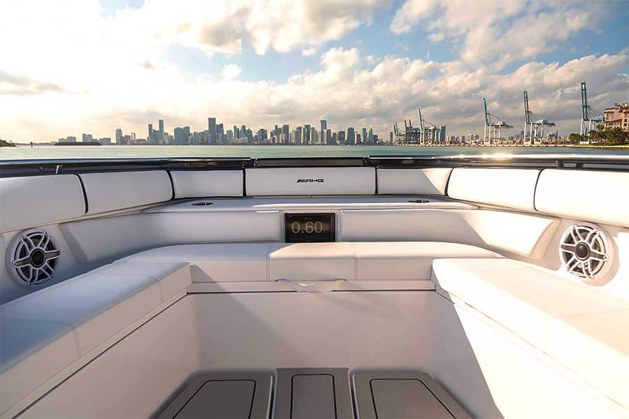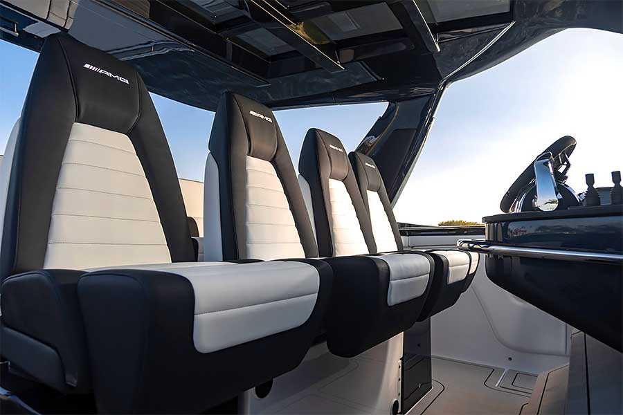 一次能夠乘載26人的59’ Tirranna AMG Edition,水面上倒映出的是和G 63 Cigarette Racing同主題的金屬黑與金色車身塗裝,以及碩大的AMG與Cigarette Raing字樣。在可遮風避雨的船篷下,駕駛艙內包括兩大數位螢幕、空調出風口和金屬把手均完美詮釋了G-Class的內裝風格。環繞駕駛艙的座椅上,除了以米黃與深藍雙色椅套包覆,表層亦經過特別的防曬隔熱處理,減低了座椅溫度受日照的影響。此外甲板下方另安排有沙發、冰箱、加大雙人床、淋浴間,以及由29支喇叭組成的5,200瓦音響系統等配備,甲板尾端則有一小塊可供烤肉和戲水使用的空間。