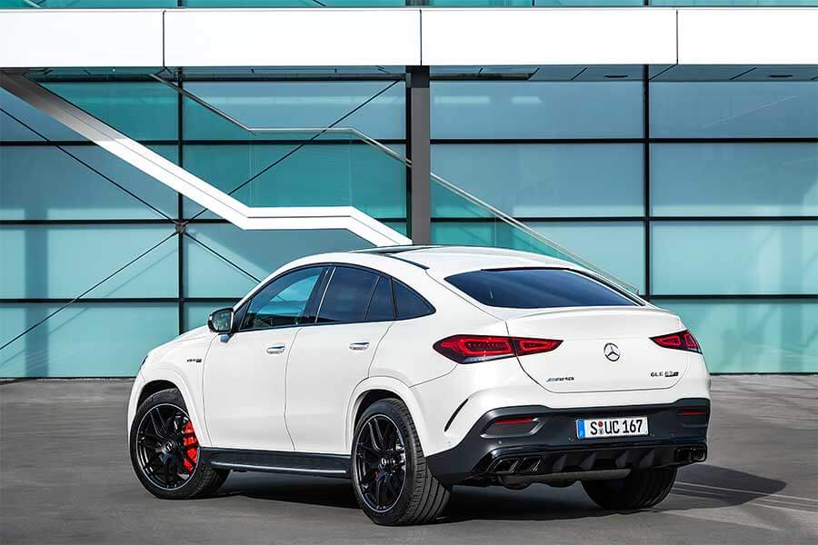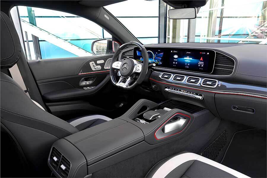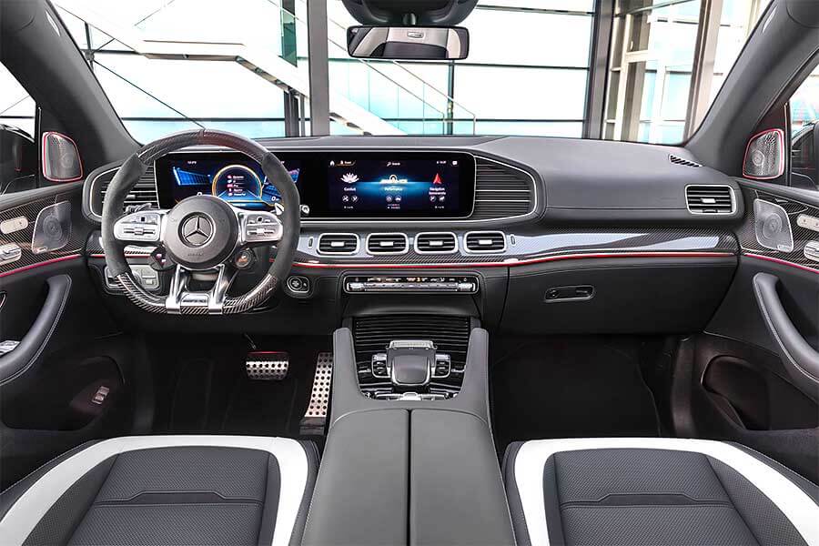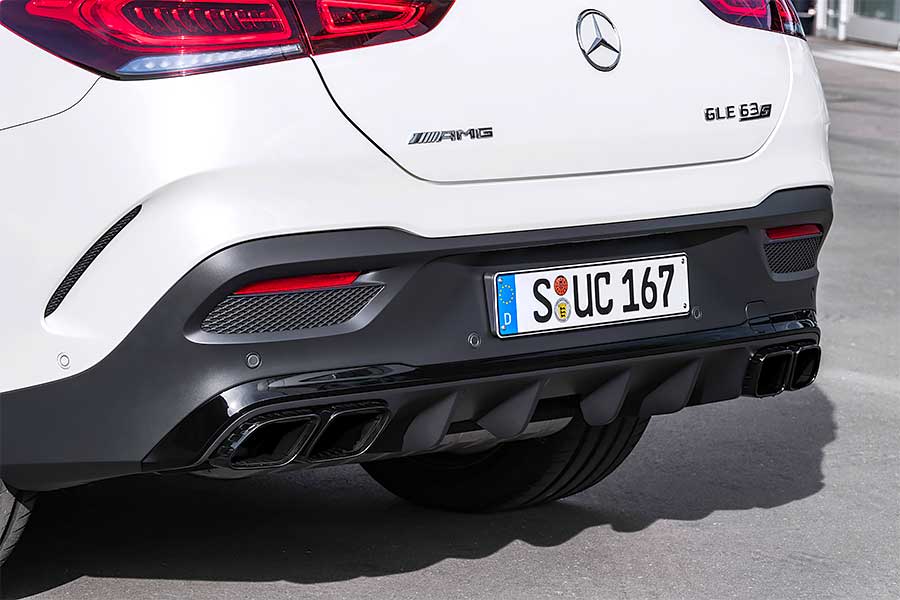除了突出的性能以外,GLE 63 Coupe同時間也具備了兼具運動與時尚美學的內外裝設計。首先,流線型斜背車頂是必備的就不必多說,搭配直瀑式Panamericana水箱罩大方展露了AMG家族的霸氣,足下則是踩著21吋AMG款黑色鋁圈(S版22吋)。再者,前後保桿亦換上新的套件、銀色鍍鉻飾條與黑色高光澤飾板和後擴散器強化力量感。內裝部分自儀表顯示風格開始,到附鋁合金換檔撥片三幅方向盤、碳纖維飾板、Nappa真皮和DINAMICA麂皮(S板)等陳設與用料皆散發著典型的AMG氣息與戰鬥色彩。