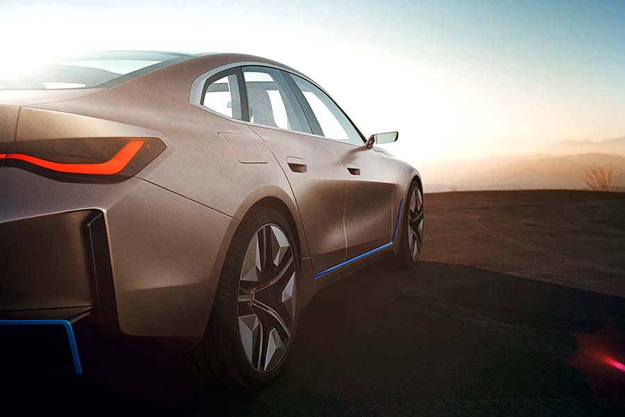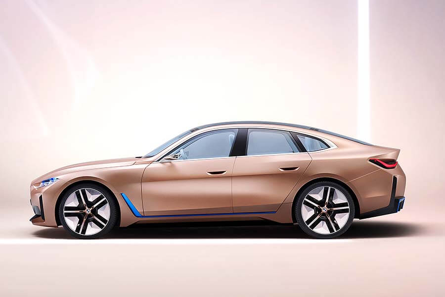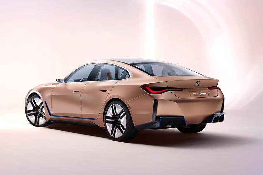 車身上,熟悉的Frozen Light Cooper烤漆顏色援用自概念車BMW Vision iNEXT,而從車頭、頭燈、車側和車尾上發出的藍光則代表了這款車屬於BMW i家族的一員,並使用著該電動家族的相關技術。當然,寶馬正字標記的「雙腎」並外為在這款概念車上缺席,只是並改變為在內部裝置感測器的智慧平面,為各項駕駛輔助與安全系統提供所需數據。最後,透過前保桿、後保桿、輕量化輪圈和擴散器等細節設計,i4 Concept的空氣力學表現得以更加提升。