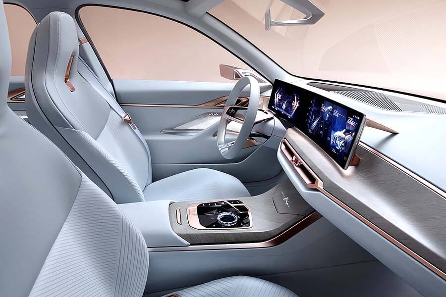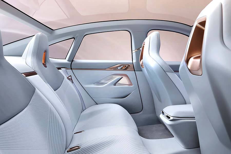 雖然i4 Concept有著轎跑車常見的斜背車頂,但後座乘客卻能享有預期之外的寬敞頭部與膝部空間。而且後座也仿製了前排座椅的整合式頭枕與運動化外型,使車內所有乘客皆能獲得同等規格待遇。此外藉由車門同車色金屬質感飾條的延伸,此處也進一步營造出了一種類似高級貴賓室般的空間氛圍。