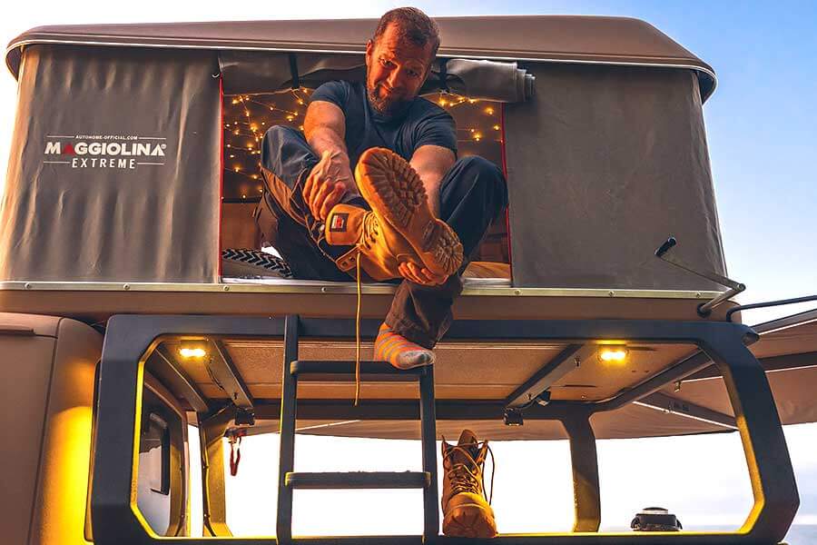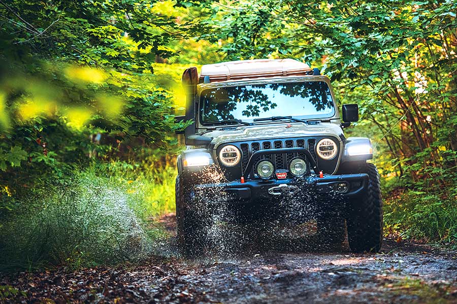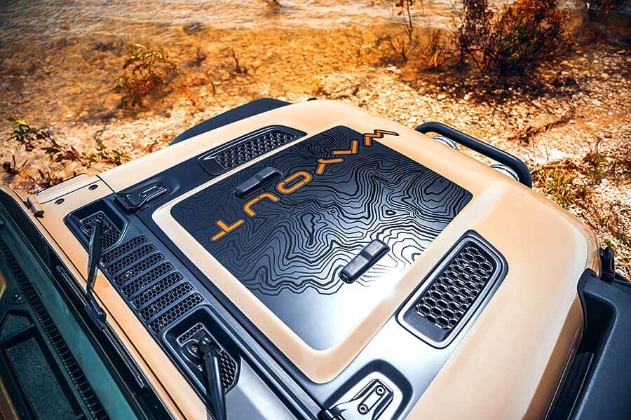 Wayout車尾兩邊葉子板都嵌入了一個備用油桶,既顯眼,又易於取用,簡單得來空間充足的車頂防風營幕則附設了匠心獨運的床架和爬梯。除了其中一邊車身設有一個270度包圍式雨篷,車上還有一個十分好用的隱藏式滑動睡床(所謂好用意指可以鎖上)、一個拉力12,000磅的Warn重型絞盤,以及方便你綑綁東西的車頂行李架(想扎甚麼都悉隨尊便),另外還有多個重型掛接鈎,工程用但相當苗條的門檻護擋,安裝於葉子板以便隨時為輪胎充氣或使用氣壓式工具的空氣壓縮機噴嘴,車身四周又設有好些低瓦數燈具,總之盡是實事求是的裝備。你還會找到一根涉水進氣管,任何東西裝上這種進氣管都會變得更好用。個人甚至很喜歡這身Gator Green/Sand車漆和非常豪邁的顏色點綴。