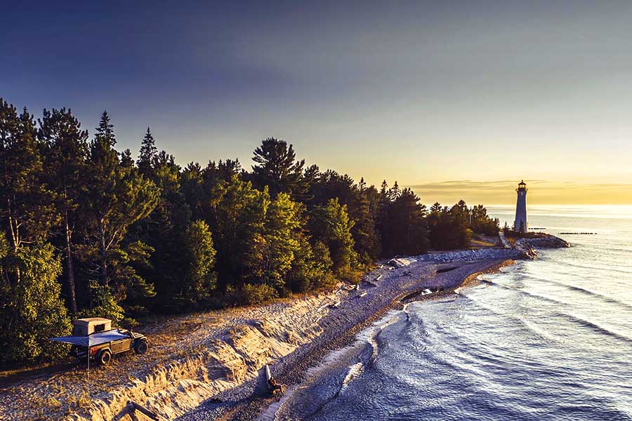 趁著太陽徐徐沒進蘇必略湖面,我趕忙著手整頓營地,簡簡單單一撐便架起車頂營幕,再張開雨篷和打開車上的雞尾酒吧(Wayout唯一的噱頭添加物)。在湖中清洗身體後,再給自己斟了一杯,望著這一幕的我不禁喟然長嘆。海邊斷崖上可見一座孤伶伶燈塔,加上海風徐來,眼前風光實在太美不勝收,彷彿一下子全部湧進腦海,令人苦於逐一細味之餘,同一時間卻又從中獲得一種鋪天蓋地的祥和感,一份心靈完全平靜的愉悅。沒有噪音,沒有電話,沒有數位事物,遠離繁囂之妙就在於此。這部車也許有點太猛,在這裏卻大有用武之地。躺在記憶發泡膠製作的柔軟地氈上,關上所有燈臥看湖面,可能是我過去一年最平和的體驗。當你腦中沒有塞滿待辦事情,自然會睡得更香更甜。