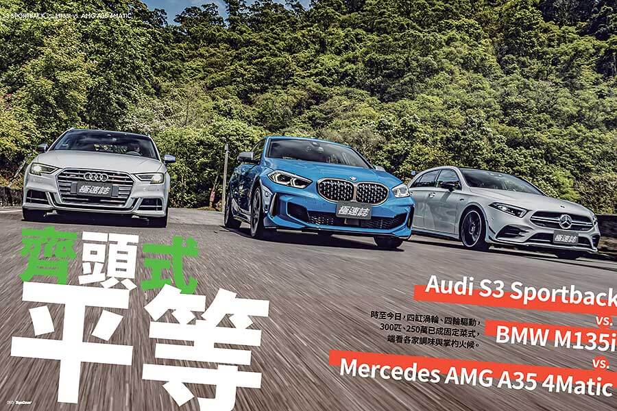 三部車總算是名正言順地在台灣相聚首,同時大家身穿的裝備以及最後的售價,通通都站在相同的立基點上,不像幾年前這三部車不是那麼的門當戶對,畢竟當時賓士靠著A45的動力優勢吸引大眾,寶馬還維持那華麗後驅舞姿,S3的300匹配四驅顯得是乖寶寶代表,但隨著時勢潮流發展,三方面對於性能掀背車的解釋方式不再是大相逕庭,而是英雄所見略同。