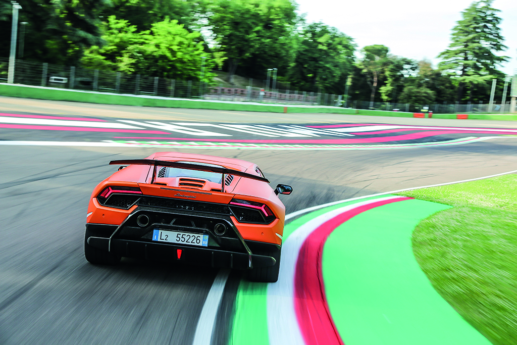 先不講Performante的一整套改良設計,我想講的是這次在Imola賽道的試車安排。多年來參加林寶堅尼的試車活動,也少不了賽道環節,但每次都是點到為止,四五圈下來便差不多了。所以,坐巴士去賽道的路上便趕緊拿出所有拍攝影片的器材,左手一套GoPro,另手又握住另一隻GoPro,一副西部牛仔片要決鬥似的,為的就是隨時打開Performante車門,以便立即安裝。跑完了第一round,四五圈左右,心想工作結束,任務不知是否完成,因為拍成怎樣也沒有空看,總之心裡想「知錯能改」的機會已隨風而逝。豈料,原來還有三個round,換之言,半天下來,跑了二十多圈,Imola每圈總長度為五公里,即我開著Performante跑了超過100公里。重點是,同場有二三十名來自世界各地的記者,我一下車,另一位記者便跳上車,廠方人員只是檢查一下胎壓,Performante又在Imola被人榨到乾一般。我從未在賽車場如此試駕林寶堅尼,真的有驚喜。