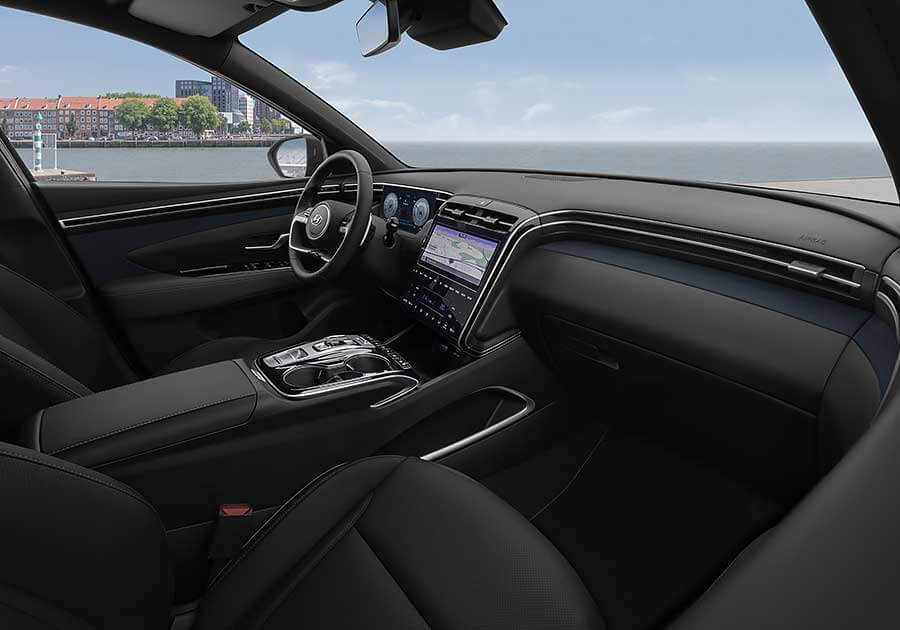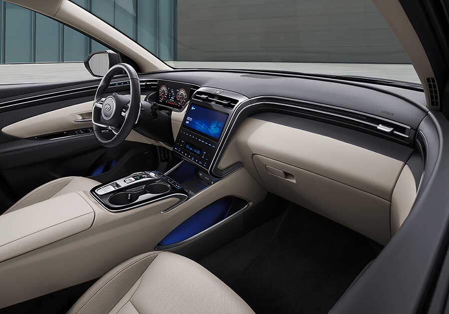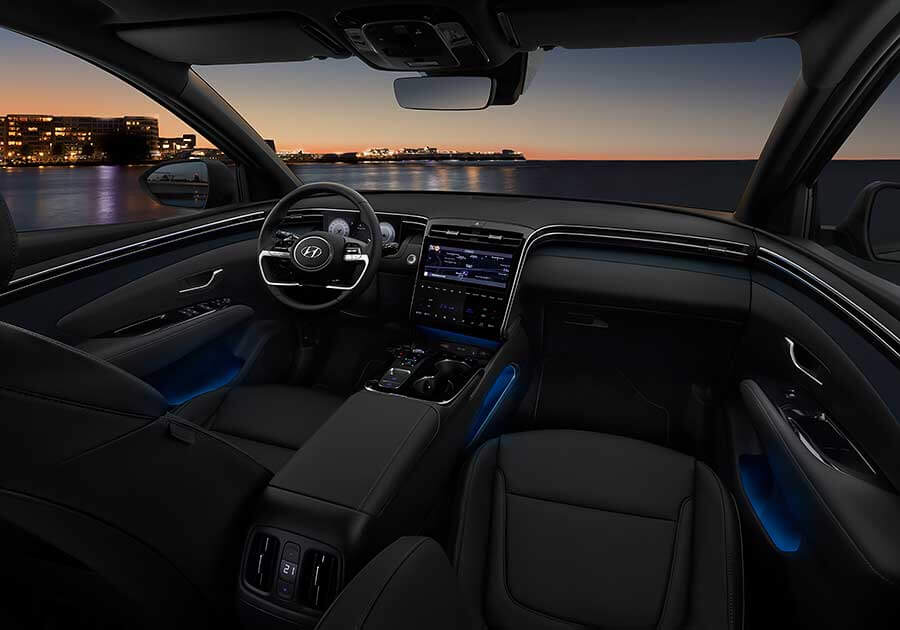 進入車內之後,首進眼簾的就是儀表板與門內飾板的Double Line風格結構設計,以及兩面大小皆為10.25吋,顯示內容也能自行設定的全數位儀表與中控螢幕。針對內裝的用料與顏色,現代在這方面給予了消費者相當大的彈性,不只可以選擇全黑皮質或布質內飾,同時也提供有黑灰雙色雙質地選項。假如這還是不中意的話,配備清單上另外還有一款以黑色皮革或布面搭配藍綠色縫線的款式可以挑選。當然,有了質感獲得提升的內裝之後,車艙內部的氛圍勢必也得用心營造,因此原廠在新一代Tucson車內還加碼導入了媲美賓士的64色,10段亮度可調氣氛燈。