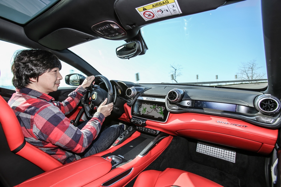 來到一段髮夾彎與S彎交織而成的道路,眼見機不可失立即加快節奏,油門一下立即應聲而出,換檔速度之凌厲比眨眼還要快,且每換一次檔後頭便傳來碰的一聲音爆,這可是法拉利引擎高速運轉時才會出現的特效。既然談到引擎就順便說一下,GTC4Lusso的3.85升V8雙渦輪增壓引擎並非直接取自California T(Tipo-F154 BB)或488 GTB(Tipo-F154 CB),核心架構雖屬同一族系,其實已針對GTC4Lusso T需求採用新設計的活塞、連桿與專屬控制軟體,因此Tipo-F154 DB的引擎代號也不同於其他兩款車型,610hp最大馬力與77.5kgm扭力正好介於兩者之間,比V12版本雖少了80hp,不過憑藉渦輪增壓的扭力特性,零至百公里加速3.5秒、極速328km/h的性能數據依舊是叱咤公路的快手一名。