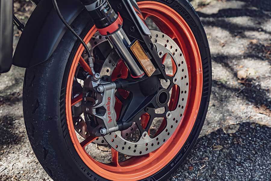 除了引擎的優化外,890 Duke R在底盤的機械結構上亦提升有感許多,前懸吊採用WP APEX全可調倒立式前叉避震,後方也裝載同系列的WP APEX全可調中置掛瓶後避震,同時開發了全新三角台因應強大的減震性能增加車頭穩定性,除此之外,在煞車用料方面直接佛心升級Brembo Stylema四活輻射卡鉗(320mm浮動盤),但可別輕易認定KTM到此打住,工程師更祭出高端的Brenbo MCS直推總泵(可模擬19-21可變活塞),下盤穩固了連煞車都天殺的快狠準,這次890 Duke R可是有備而來,相對790 Duke來說,我輩亦認為890 Duke R才是KTM老二的完整之態。