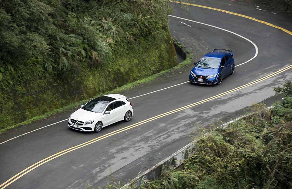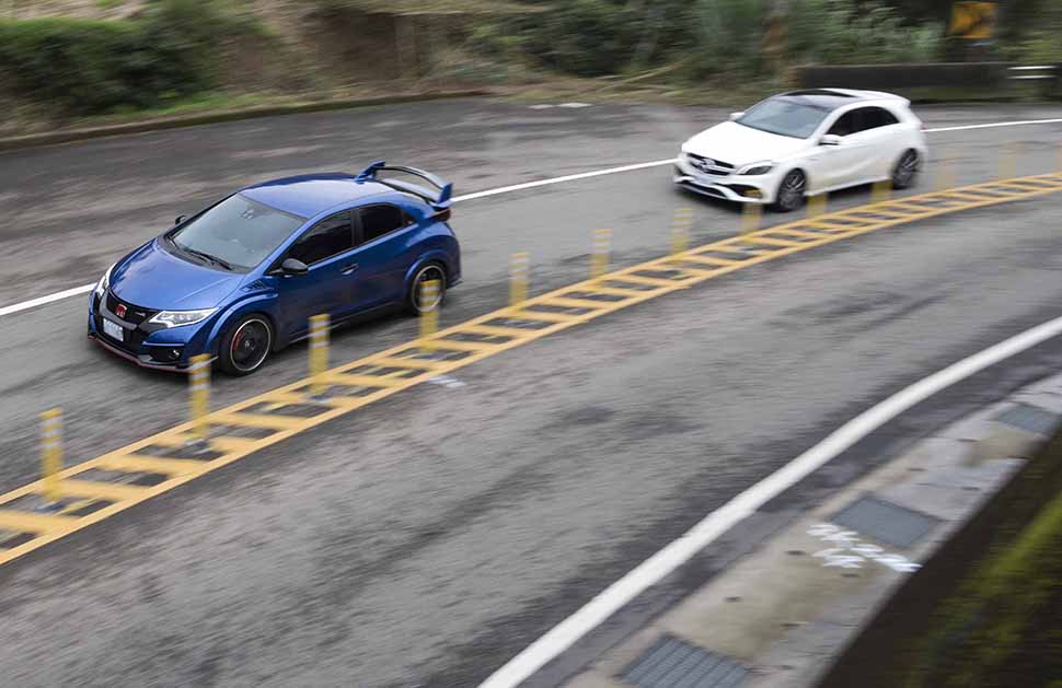 由於駕駛者可以準確拿捏動向,下盤又穩健,一旦施展開來,整輛車就像天生的賽道胚子,殺進彎道的速度異常之快,讓信心指數也跟著提高了幾級,只是有時會感覺避震器的強度過高了些,某些低速大彎角容易出現彈跳,這時也因為功率值及變速箱的差別,A45 AMG的出彎反應確實快上許多,讓Type-R每次總要猛踩油門苦苦追趕,也不時考驗駕駛者控制排檔與踏板的手腳協調性與判斷力,一個猶豫可能就讓對手瞬間拉開三五個車身。