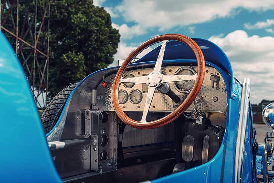 廠方先後製作了大約五百部縮水版Type 35,使得這件作品成為迄今為止傳世數量最多的古董級Bugatti。我們這天便見識了一件趣致又養眼的古銅色原作,身家估計約值8萬鎊。Harrison和我根本沒有辦法把雙腳放進這件老爺玩具的車艙(無論雙腳穿上十分紳士的榮面布洛克鞋或者防火賽車靴都沒轍),不過倆布簇新Baby II到式肯定可以讓我們玩兩手。