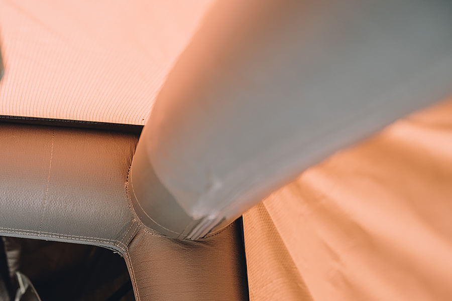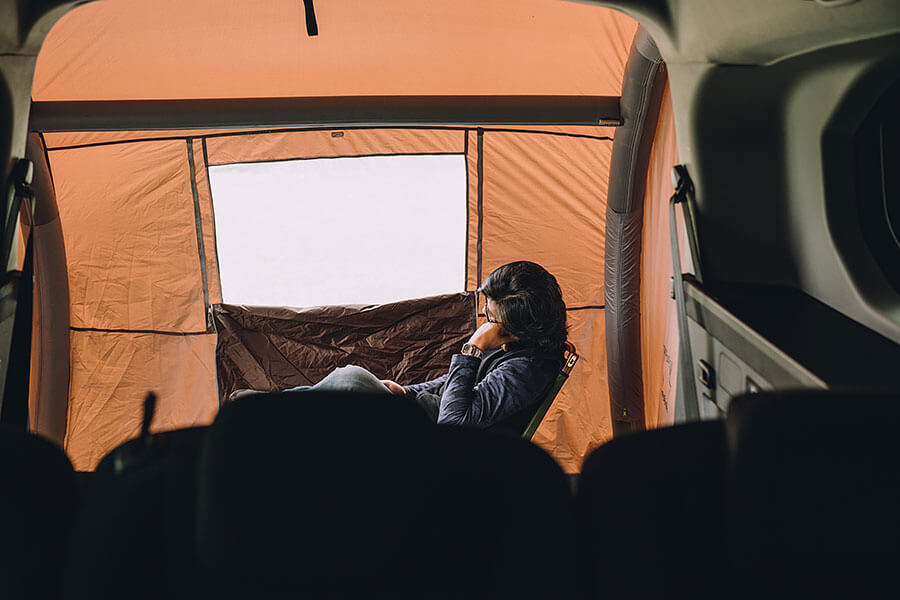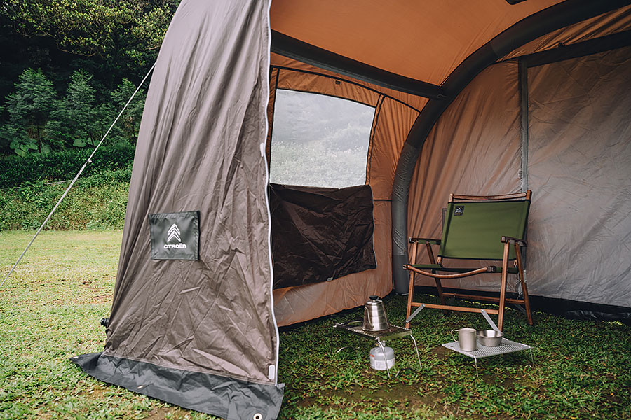 而在撐起帳篷之後,這才發現剛剛藏身在約莫50公分長的旅行袋裡的器材,可以放大高達五倍,形成一個長寬250公分,高度達180公分的空間,不管是當作起居或是客廳空間都非常適合,寬裕的空間我覺得可以來一場四人圍坐的牌局。而深色外帳也成為很好的天然遮陽效果,帳篷兩側也都設計了寬大的開口,如果自行多準備一下固定桿,還可以享有兩大面天幕,整個活動空間又更顯得寬廣,再加上也保有透氣窗的設計,保證可以全方位吸收芬多精。除此之外,這組充氣帳還有一個便於移動的好處,因為充氣後可以自行保持帳篷結構,非常輕盈的重量可以一個人從帳篷內就可輕鬆移動,也就可以讓我們雖時配合使用需要將充氣帳設於車尾或是車側滑門,例如在白天活動時,就很適合將充氣帳安排在車尾,拉開兩個開口以及Berlingo的側滑門,帶來一個非常開闊與流通的空間環境,等到夜深時分,把充氣帳移動到車側,關上其餘車門,我想也會提供一個相當安心好睡的休憩空間。