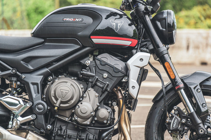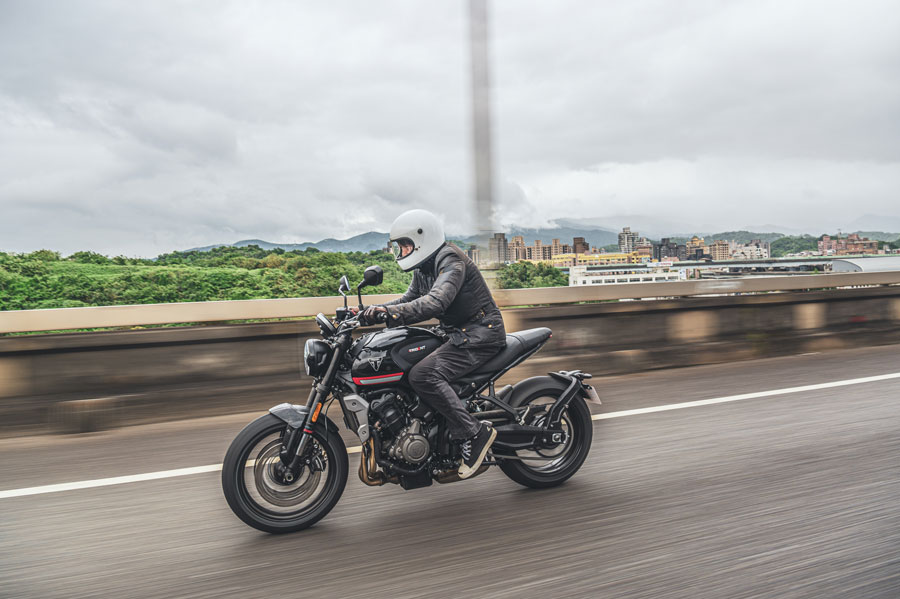 三缸引擎是這次Trident 660的核心所在,即便自1990年重生後凱旋陣營主打的就是直列三缸引擎,那這次有啥特別?Trident 660這具三缸引擎與Street Triple RS、Speed Triple RS及Moto2有著相同的DNA,不過排氣量縮減至660c.c.,在速度未拉高前,有些懶散的油門反應讓我不太習慣,但隨著車速及轉速逐步拉高,後勁來的又快又急,隨著每次右手扭轉油門,除了要配合左腳在適當時機進檔的同時迅速收油(快排屬於選配,試乘車未裝),雙手還必須抓的夠緊,否則車子一過6000rpm往前射出的那一刻還是會令你腹下一酸且發出不知所為何來的怪聲音。
