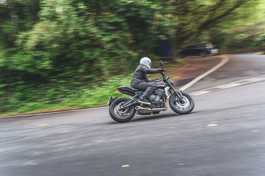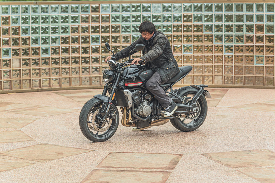 它給我的第一印象就是極為輕巧又靈活的運動性,稍稍前傾的騎姿讓身體以最自然的姿態跨坐車上,短軸距及角度不大的前叉後傾角(Caster),讓雙手的輕微動作都可以直接反應在轉向的控制上,身體或臀部無須挪動,只須運用逆操舵技巧就可以在連續彎路上來去自如,很好上手的一部車。如此特性就我個人對凱旋的印象而言算是相當新鮮,要知道直列三缸引擎雖兼具並列雙缸引擎高扭力及直四引擎高轉大馬力的特性,但先天條件上應該不至於活潑到這種程度,若說是因為受惠於車重較輕,189kg(濕重)看起來也算不上特別厲害,看來廠方這次在機械配置、車架設計與重心方面確實下了相當多苦心,這一點值得肯定。