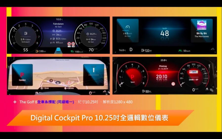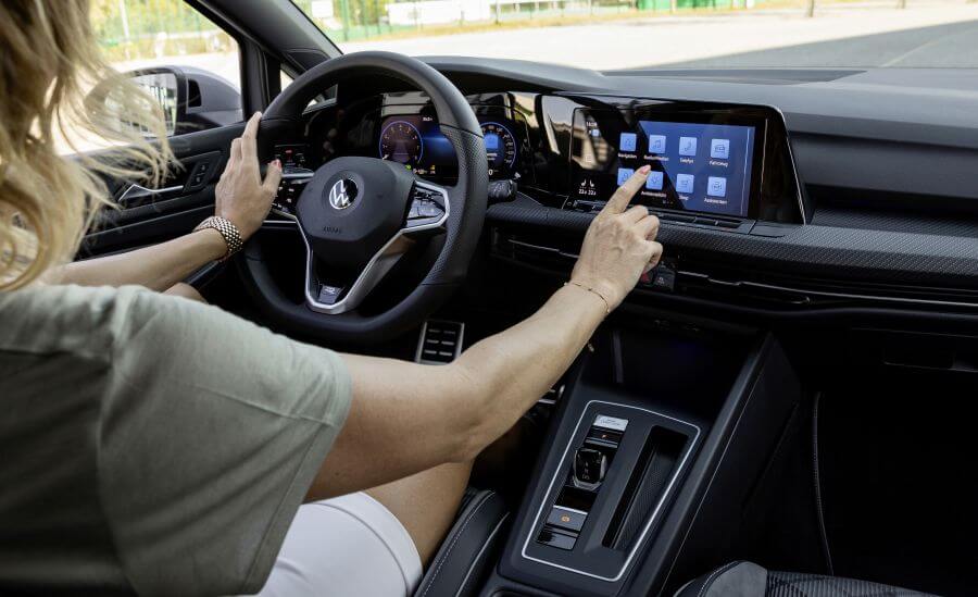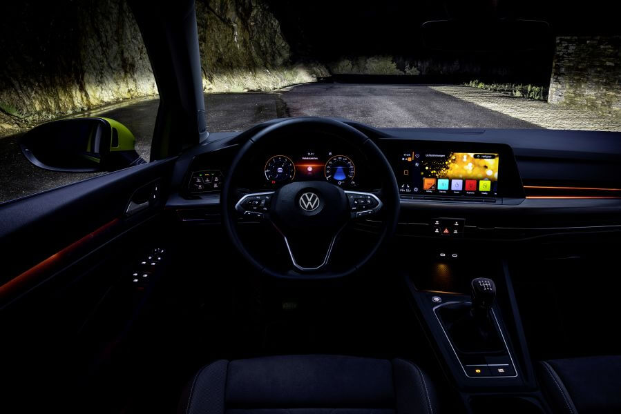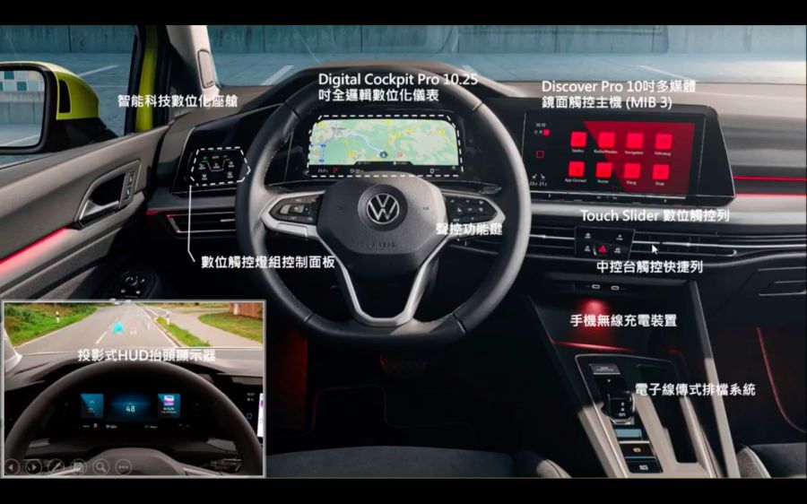 新車將全面標配10.25吋數位儀表並用有四種顯示方式,中控主機則會有8.25吋與10吋種不同的主機,前者為230車型搭配,後者為280、GTI所用,另外還將會提供全新的前擋投影式HUD顯示器搭配在高階車款上,控台介面也改採全觸控式的介面安排,也讓Golf正式進入全電子線傳技術的世代,其中新式排檔組還會在煞停狀態中當車門開啟時自動切入P檔,凸顯Golf已然套用大量新世代科技應用。