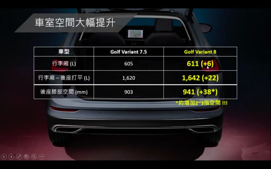 Golf Variant本次將會同步隨掀背車引進,動力規格將採單一280的配置,其中空間部分有相當大的進展。主因在於新一代Golf Variant在軸距上也同步增加,加上車長提升換取更大空間,行李箱容量升級到611/1642公升,後排膝部空間則是從903mm成長到941mm之多,對於家庭實用買家來說,空間運用性會更高,而旅行車款也將是全車系唯一提供電動尾門(腳感應)的車型。