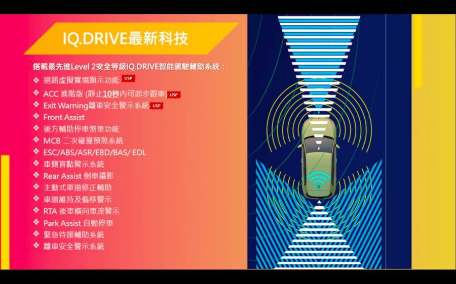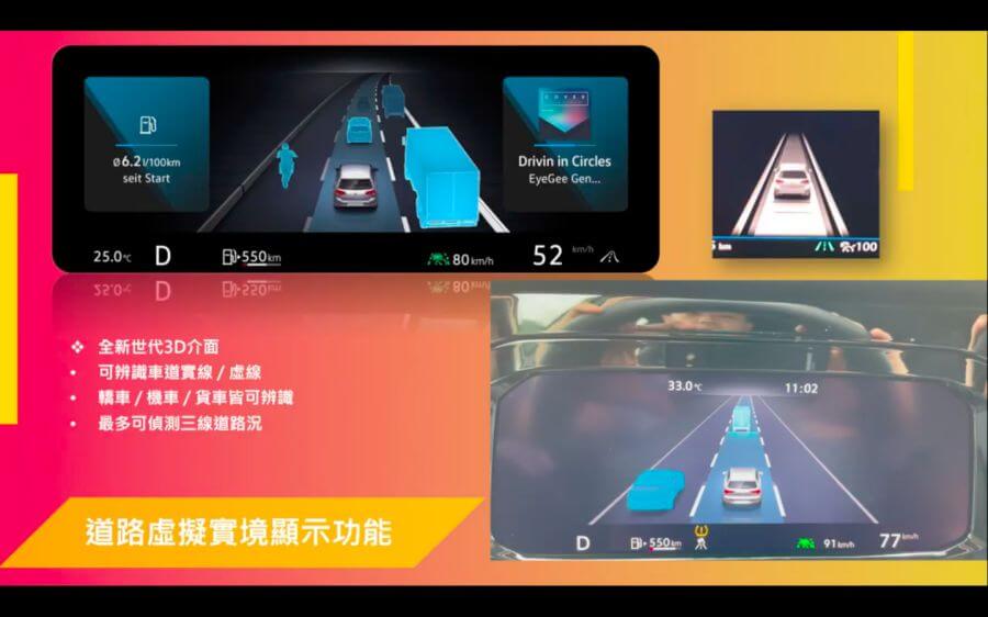 主動安全配備已成為目前的新車必備項目,8代Golf將會全數標配ACC主動巡航控制,並擁有停等10秒自動重啟的功能,230車型則配有盲點警示、二次碰撞預防、後方預煞與倒車攝影等配備,280以上含GTI則會配有大全套的IQ.Drive主動安全配備,諸如車道修正、維持與警示,後方橫向車流警示等;此外還有兩大新配備進駐,其一為道路虛擬顯示,在執行半自動駕駛輔助時,數位儀表與Tesla、BMW等車相同可顯示外部即時路況偵測,另外還有離車警示系統,可在熄火後三分鐘內裡用盲點警示燈組與音效做出警示。
