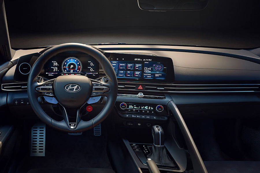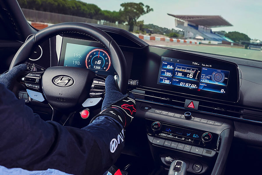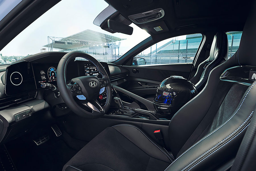 內裝部分,全新Hyundai Elantra N直接把原廠現有的最好裝備全部一起打包上車,包括由雙10.25吋螢幕所組成的全數位駕駛艙,以及兩張座高降低10mm,同時能給予車輛駕駛更多支撐性、更低重心、高度人車一體操控感受的賽車椅。此外,既然是剛加入Hyundai N高性能部隊的新兵,Elantra N駕駛座前方肯定也免不了換上部隊專用,附有換檔撥片、N Mode、NGS快捷鍵的多功能方向盤。而透過同樣也是全新的多媒體資訊娛樂系統,另可進行單圈計時,或者油量、水溫和G力監控功能的操作。