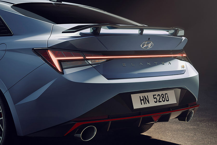 以新世代Elatnra,或者更精確地說,以Elantra N Line的基本外型作為基礎,全新Hyundai Elantra N的外觀造型自然更有那種我輩常掛在嘴邊的性能味,特別是那一身Hyundai N高性能軍團專屬的Performance Blue淺藍色制服,以及環繞全車的鮮紅色裝飾線條。除了色彩和徽章使用的差異之外,透過專屬半霧面黑色水箱罩、前擾流翼、後擴散器和Michelin Pilot Sport 4S 245/35ZR 19輪胎的搭配,使得Elantra N整體視覺看起來比現有的另外兩版車型更寬、更低趴。不過,談到全車外觀最引人注目的部分,那絕對非那支安裝在行李廂蓋,並且實際上有助於對提升空力性能和出彎速度的固定式尾翼莫屬。
