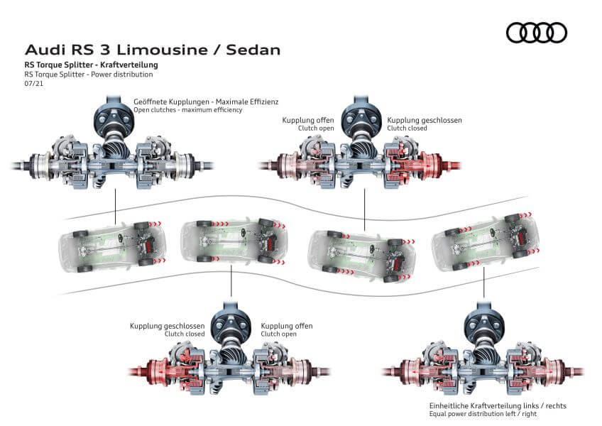 動力效率提升之外,操控能力也隨之進化。RS 3採用了一套全新的後軸電子離合器系統,具備更強大的扭力分配功能,除了配合各種行車模式提供最適化的驅動分配,RS Torque Rear模式就是目前鋼砲屆最火紅的甩尾模式,另外RS 3也設計了一個專屬的終極操控模式,在四驅系統、新版電子避震器、加大前輪傾角以及可選配倍耐力Trofeo R半熱熔胎,整體車高也比S3再降低1公分,廠方號稱這個組合將視轉向過度或不足於無物,提供最佳衝刺效果的極端中性駕馭感,搭配可變閥門排氣系統的直通狀態,更進一步放大直五引擎的獨特聲浪,等等,這招應該是跟藍寶學來的。