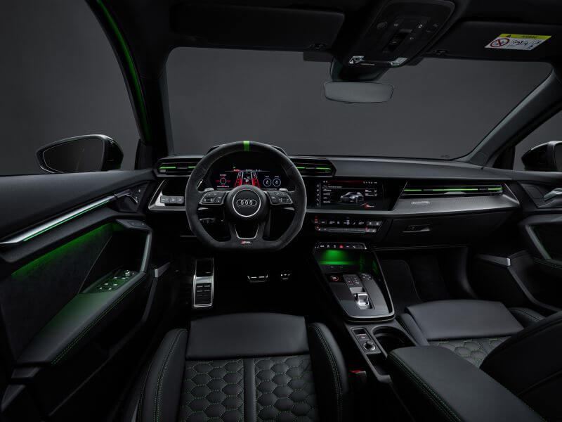 而在動力達到此級距上限,到底該怎麼提升實際的性能表現,當然是要從整套驅動系統與底盤設定來下手,整體電控、四驅系統以及7速雙離合器變速箱的優化下,RS 3的百公里加速進步到3.8秒的超跑水準,極速預設為250公里,但可升級動態套件提升至最高290公里之譜,儼然不太給現任RS二哥 RS 4面子。