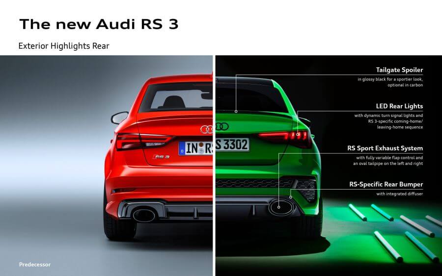 第三代RS 3依然提供Sportback/Sedan雙版本車型,直列五缸依舊,輸出設定為400匹/51.0公斤米,看起來帳面數字進步不大,但是引擎動力曲線形成兩段高原式輸出,51公斤米的扭力在2,250-5,600rpm間維持高峰,隨後馬力峰值也會從5,600rpm延續到7,000rpm,不管是馬力還是扭力,奧迪通通不吝嗇。